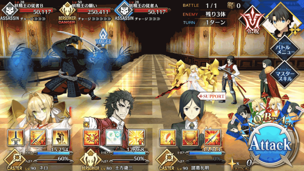 敵はアサシンとバーサーカーのみなので、キャスター中心のパーティを組もう。最後に高HPのバーサーカーが単体で登場するため、単体宝具のアタッカーを編成すると楽になる。
