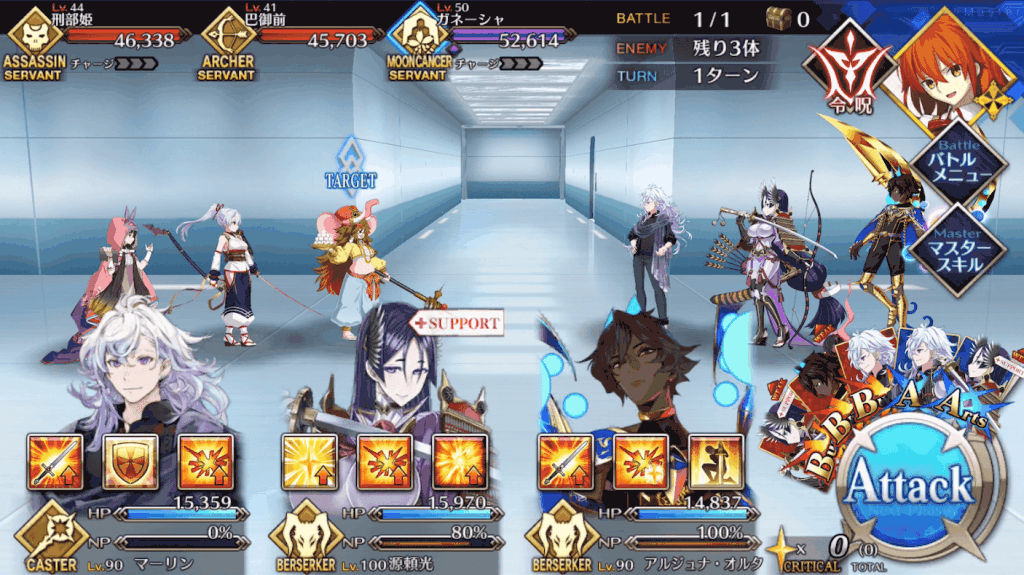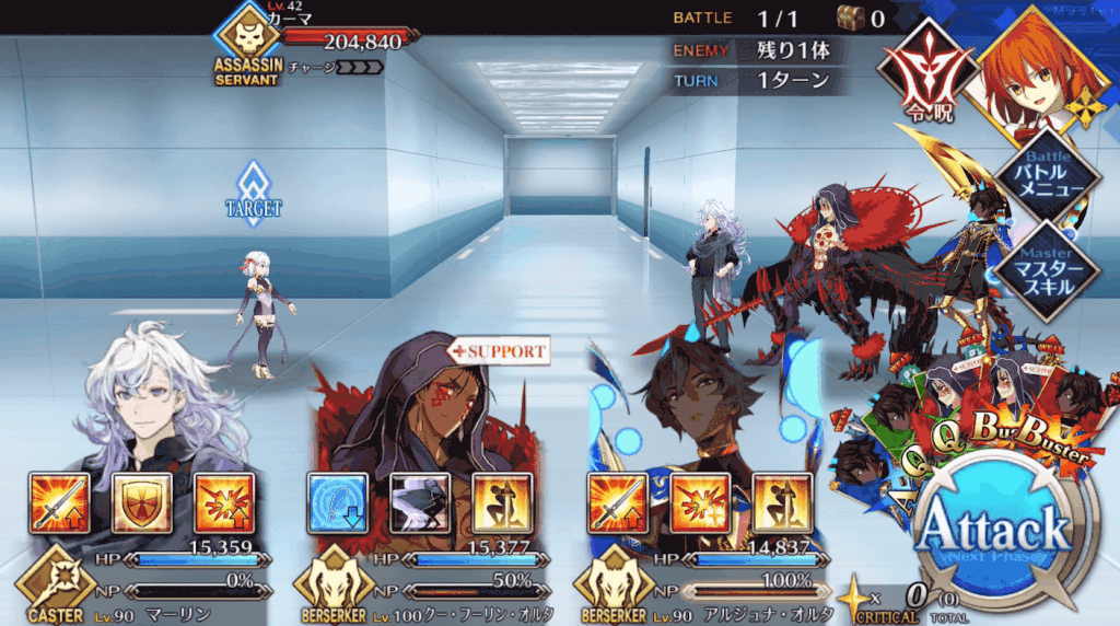 相手は高HPのアサシンなので、1体は単体宝具キャスターかバーサーカーを連れて行くと良い。