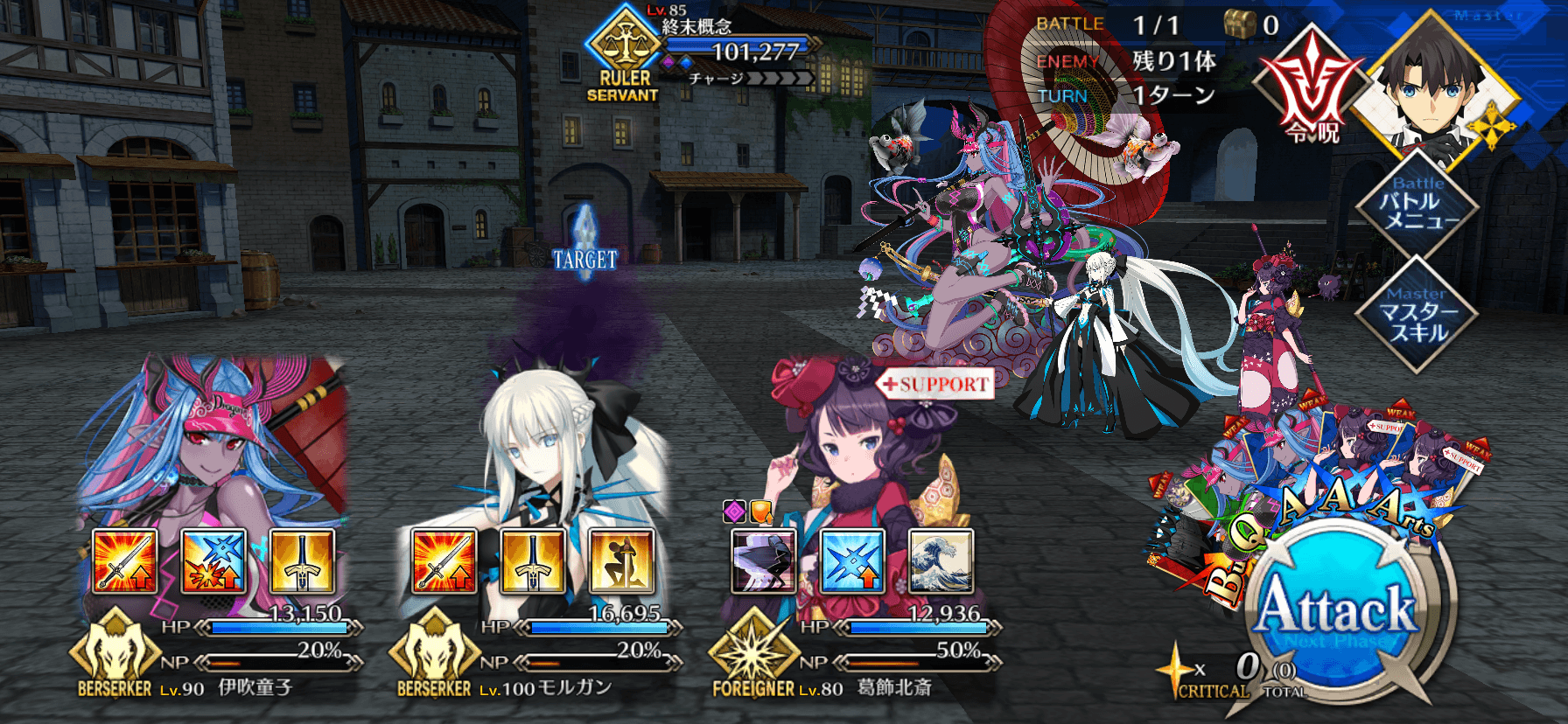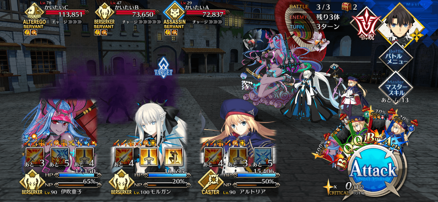 | ・ゴッホに特殊バフ付与 ┣Q性能アップ(永続)&NP50%チャージ ┗毎ターンNP20%&スター10個獲得(各5T) ・開始時、NPC北斎にバフ付与(永続) ┣[裁]に対して相性有利になる状態 ┗防御力アップ ・ブレイク1回目で敵にバフ付与 ┣クリ発生率アップ(永続/解除不可) ┣毎ターンチャージ+1(3T/解除不可) ┗「通常攻撃時、敵単体に防御力ダウン(1T)を付与する状態」(3T/解除不可) ・ブレイク2回目で特殊行動 ┣敵にガッツ付与(1回/10%/解除不可) ┗マスター側全体に強化無効(1回)付与 |