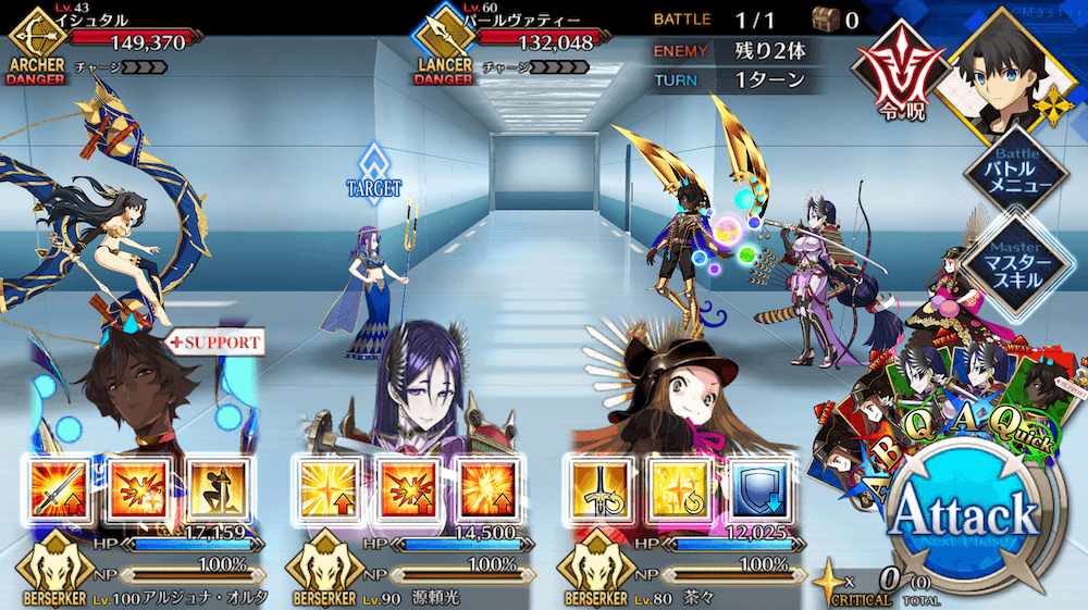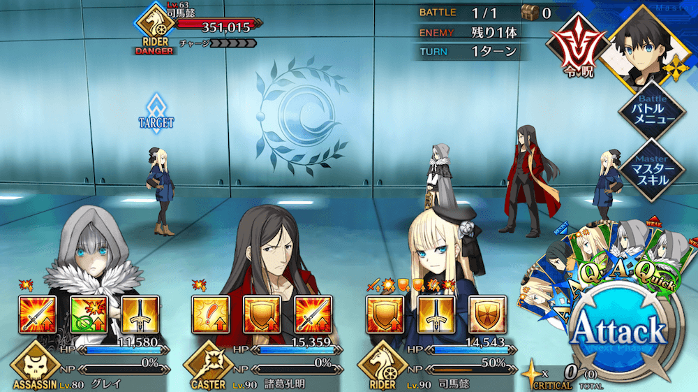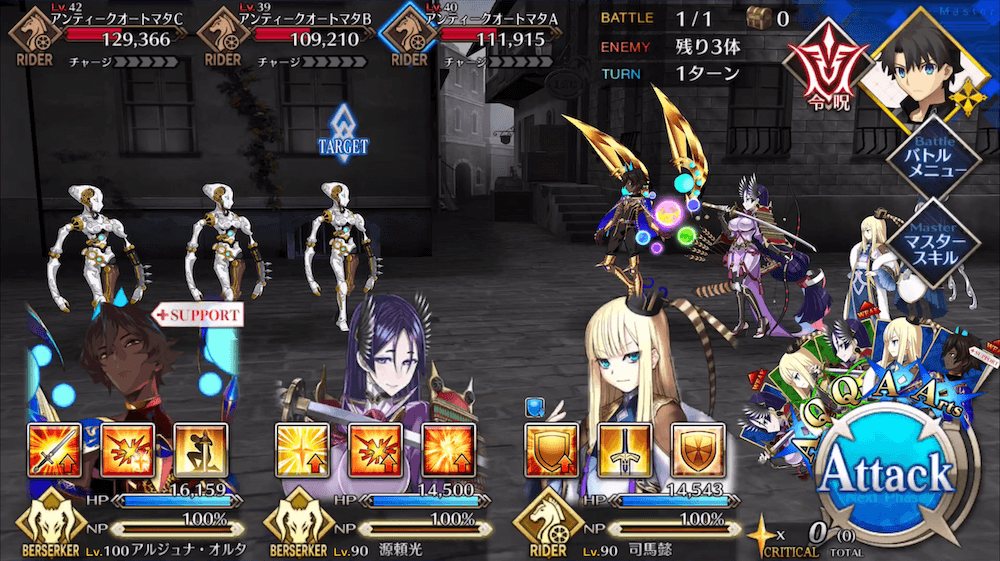 | 開幕でライネスにバフ付与(各3T)攻撃力アップ+ダメージプラス+NP増加(10%)防御力アップ+ダメージカット+NP増加(10%)クリ威力アップ+NP増加(30%)] |