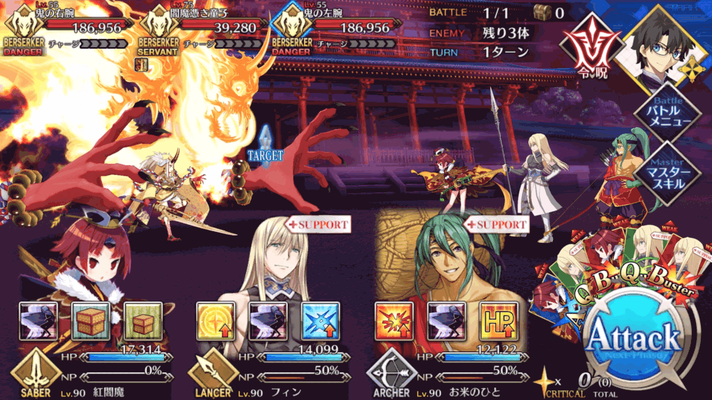 | 編成制限手持ち紅閻魔+NPCフィン/剣ディル/俵藤太で出撃NPCは全員Lv90/スキルLv6/宝具Lv2 |