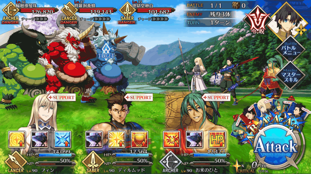 | 編成制限NPCのフィン/剣ディル/俵藤太で出撃全員Lv90/スキルLv6/宝具Lv2 |