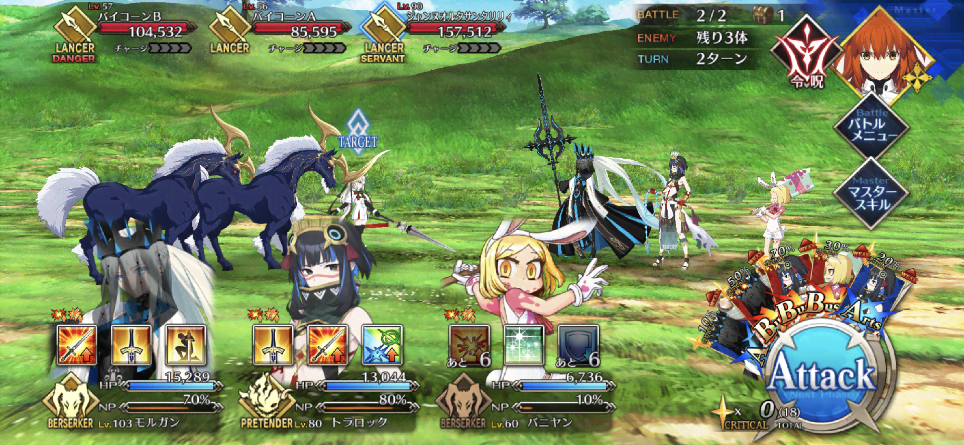 | ・宝具ランク[B]→[B+] ・宝具威力が強化(300~600%)→(400~700%) ・HP回復が強化(1,000~5,000)→(2,000~6,000) |