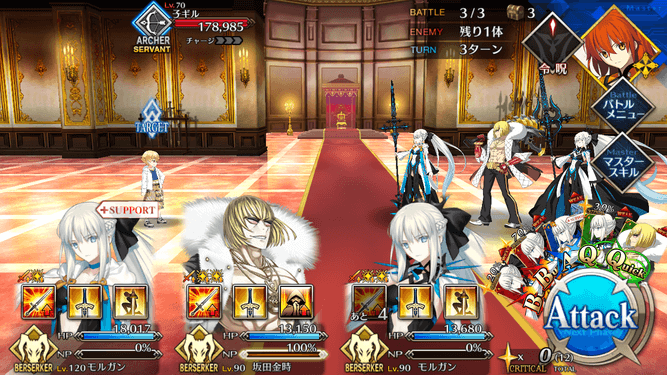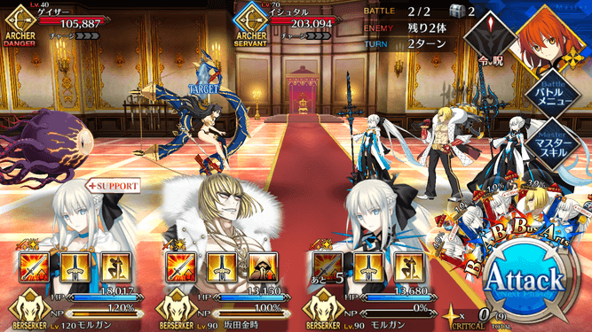 | ・宝具ランク[B]→[B+] ・自身に必中付与が追加(1T) ・宝具威力が強化 (1,200~2,000%)→(1,600~2,400%) ・即死が強化(50~100%)→(60~100%) |