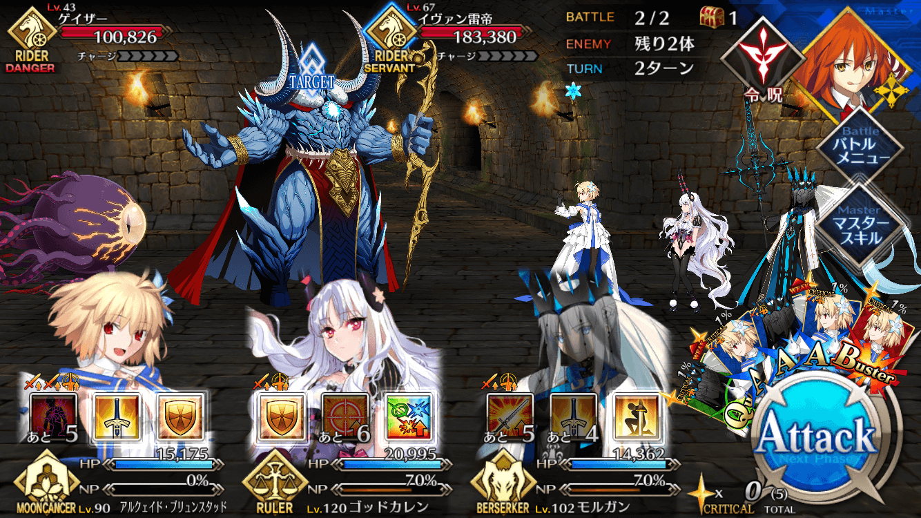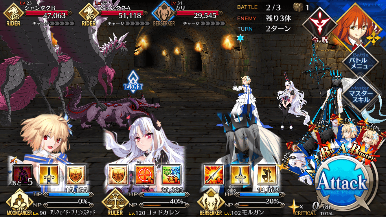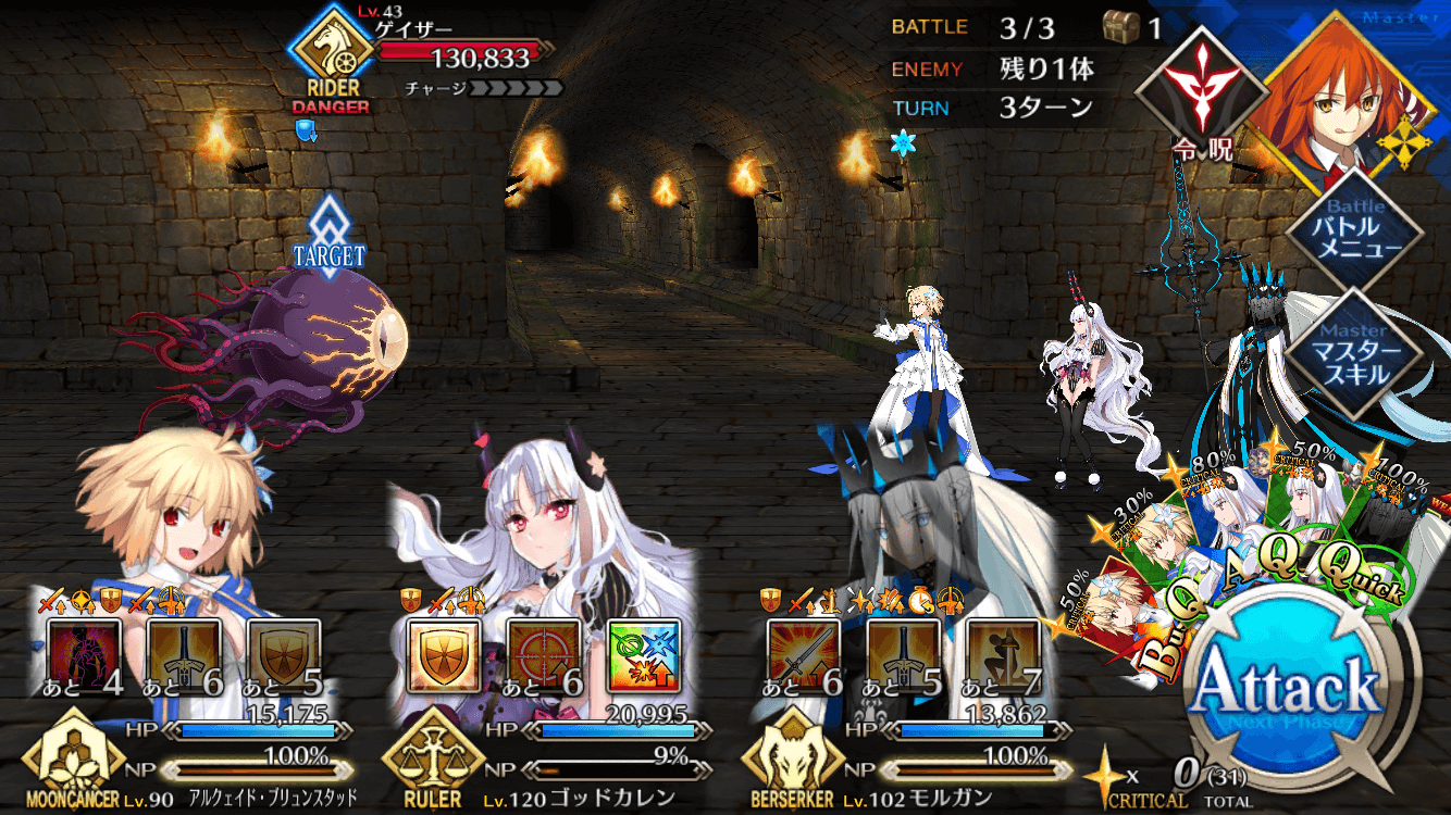 | ・軍略[B]→悪魔の軍略[A] ・宝具威力アップの倍率強化 (9~18%)→(10~20%) ・宝具威力アップの効果時間延長 (1T)→(3T) ・味方全体のB性能アップが追加 (3T/10~20%) ・自身に被ダメージ時効果(3T/5回)追加 ┗敵単体の防御力ダウン(3T/10%) |