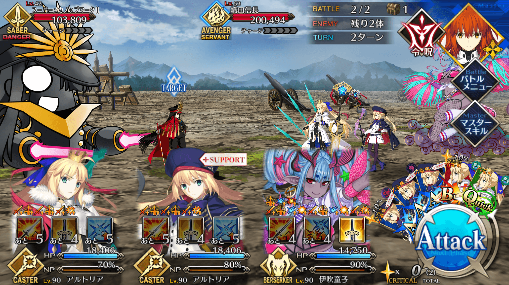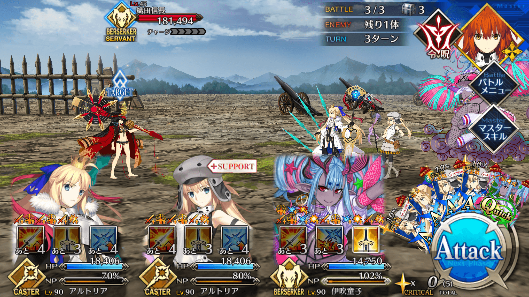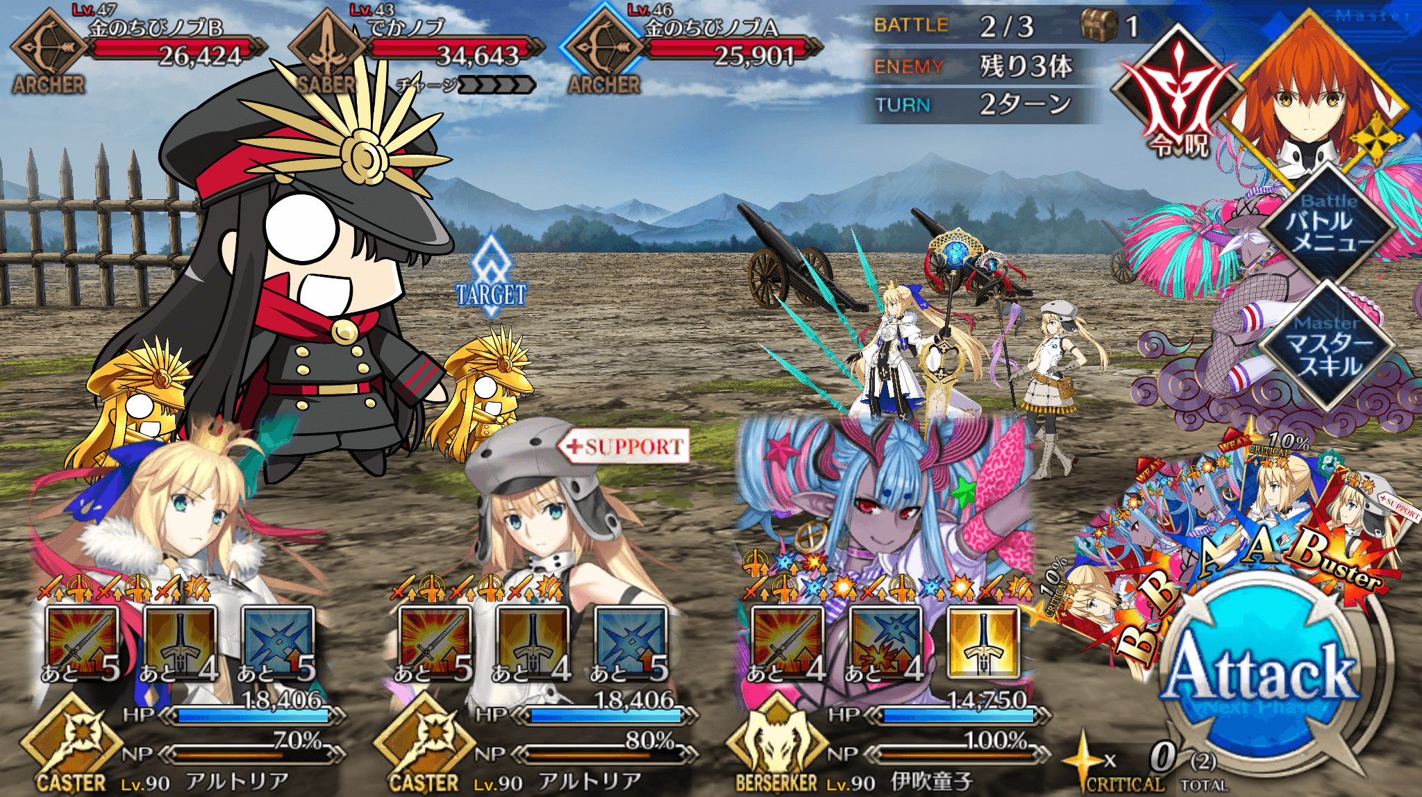 | ・戦略[B]→信長タクティクス[B] ・全体にバスター性能アップ追加(3T/10~20%) ・全体に宝具威力アップ追加(3T/10~20%) |