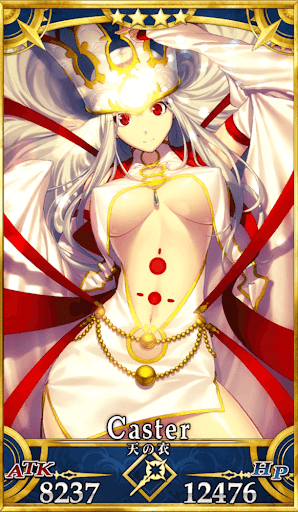 | スキル | ①自身の与回復量をアップ(3T/50%~100%) ②NPを増やす(30%~50%) ③自身を除く味方全体の宝具威力をアップ(3T/20%~30%) ①自身に無敵を付与(1T) ②NP獲得量をアップ(3T/20%~30%) ①味方単体のHPを回復(2,000~3,000) |