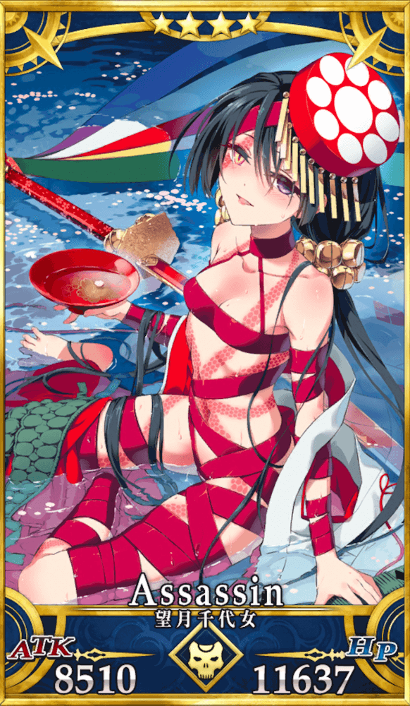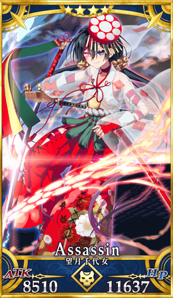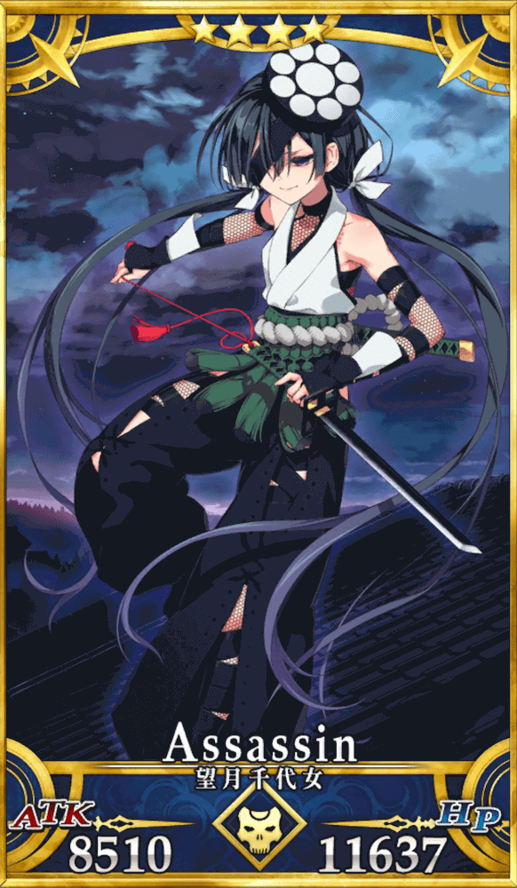 望月千代女は敵の妨害に長けたサーヴァントである。宝具によるスキル封印や、スキルの宝具封印で敵の行動を阻害できる。また、敵に付与可能な「呪い」がトリガーの特攻を持つため、「魔性」特攻もあわせて特攻アタッカーとしても活躍できる。