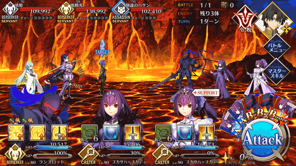 | 宝具 | ・Lv敵全体に強力な攻撃<450%~750%> ・OC防御力をダウン(3T)<20%~40%> ・スキル封印を付与(1T)<-> |