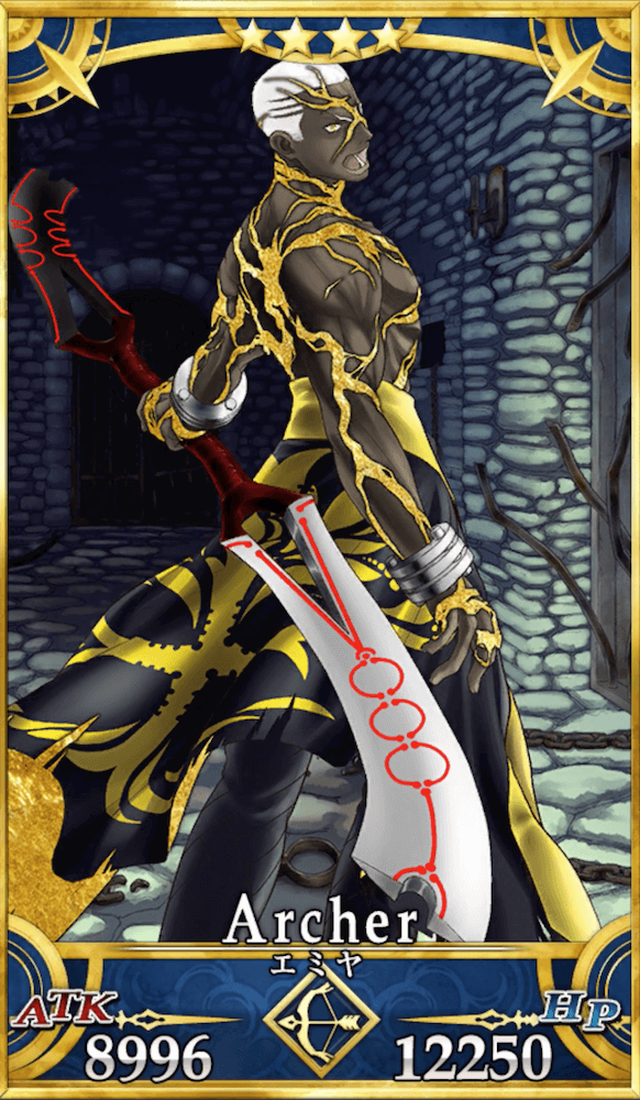 ・宝具ランク[E~A]→[E~A] ・宝具威力が強化 (900~1,500%)→(1,200~1,800%) ・チャージ減少が強化(60~100%)→(80~100%) ・投影魔術[C]→回路接続(違法)[B+] ・カード性能アップ1T→3T/3回 ・NPチャージ追加(20~30%) |