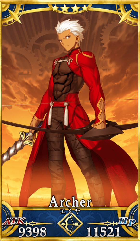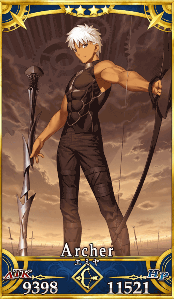 アーチャーのエミヤは全体宝具でスターを大量発生させ、威力の上がったクリティカルで敵の撃破を狙う、自己完結型クリアタッカーである。また、宝具種をアーツに切り変えればNPを大量回収できるため、宝具の連射もできると臨機応変に運用スタイルを変えられる。