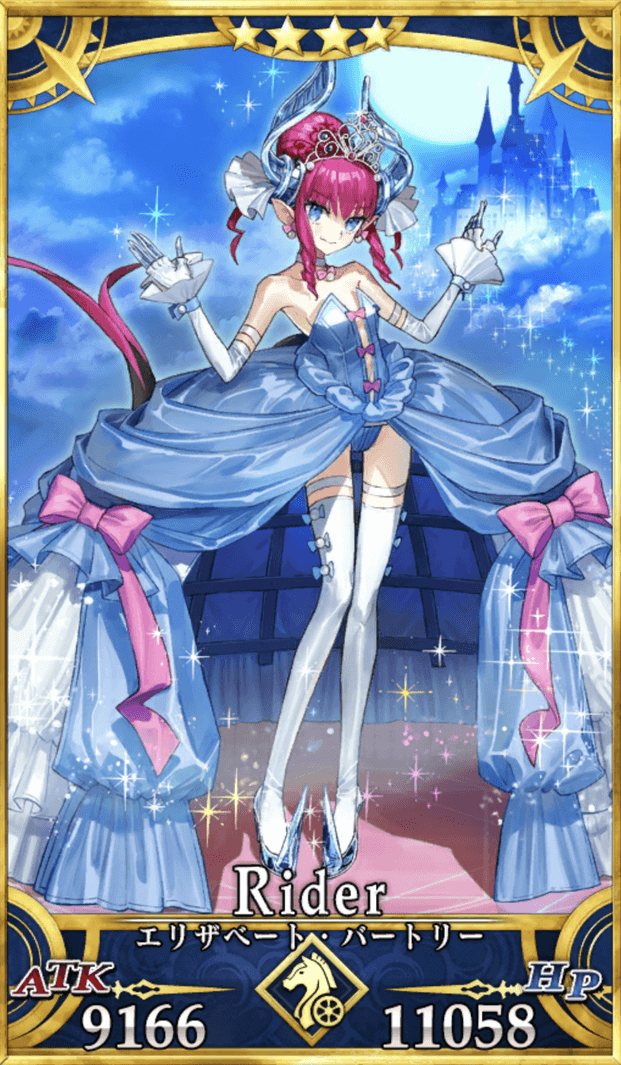 | 本来のエリザベートが更にメルヘンに突っ走った、恋に恋する夢に夢見る乙女シンデレラ。 ポップなアイドルからミュージカルなアイドルに転身。 だから~ちょくちょく~唄うのよ~♪ なお、この霊基の前段階の状態として、蛹(さなぎ)状態……粗末な服を着た、物語当初のシンデレラのような姿になる。 ある時点で、王子に見初められたと判断されると、霊基はドレスを纏ったものへと変化する。 |
