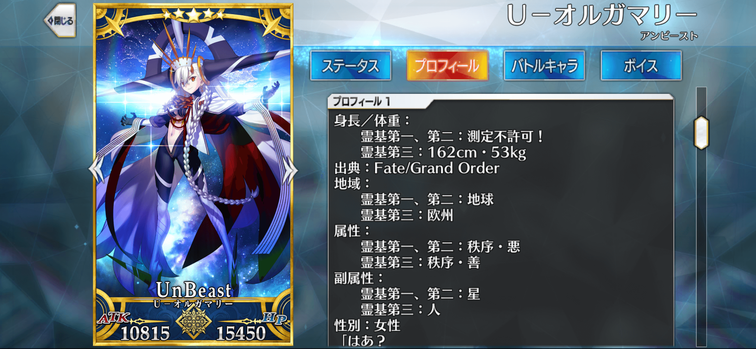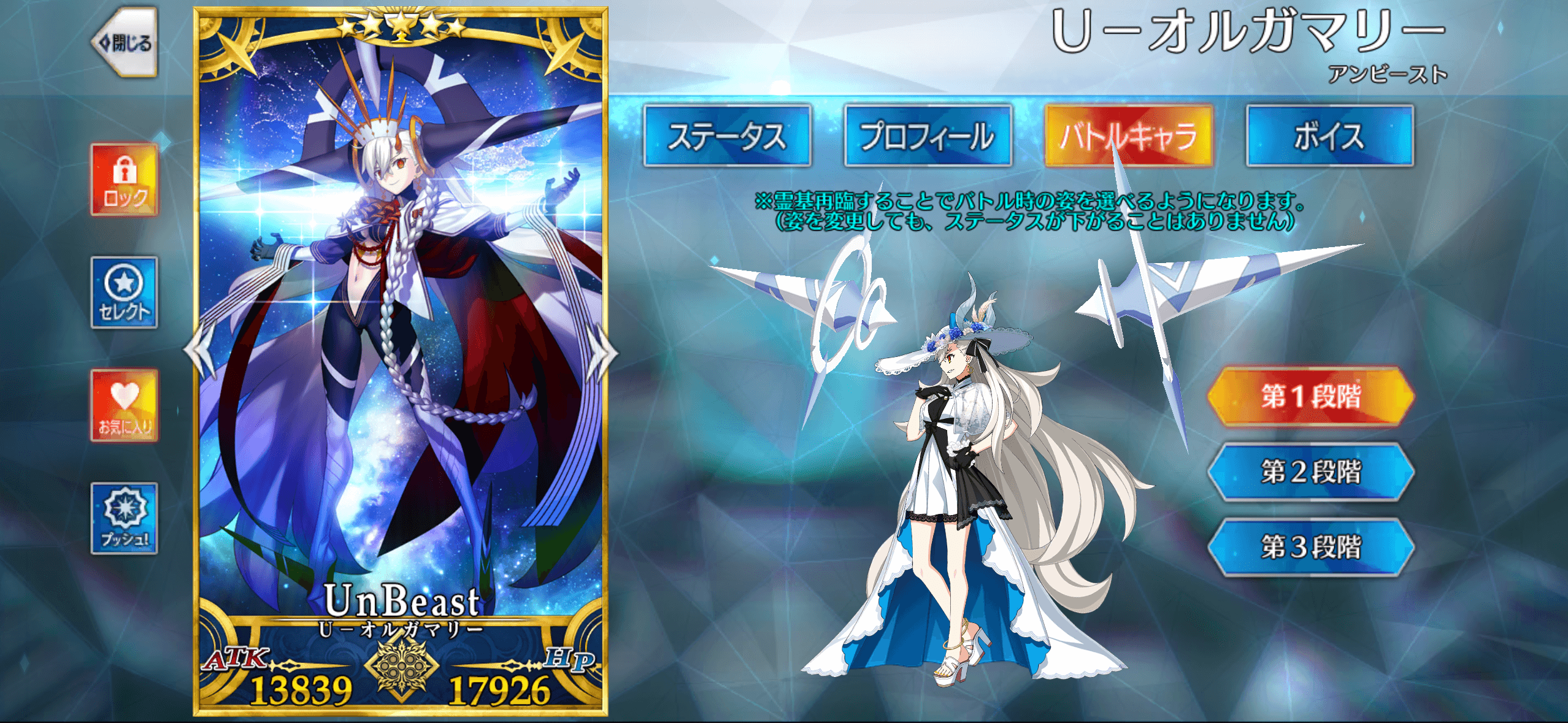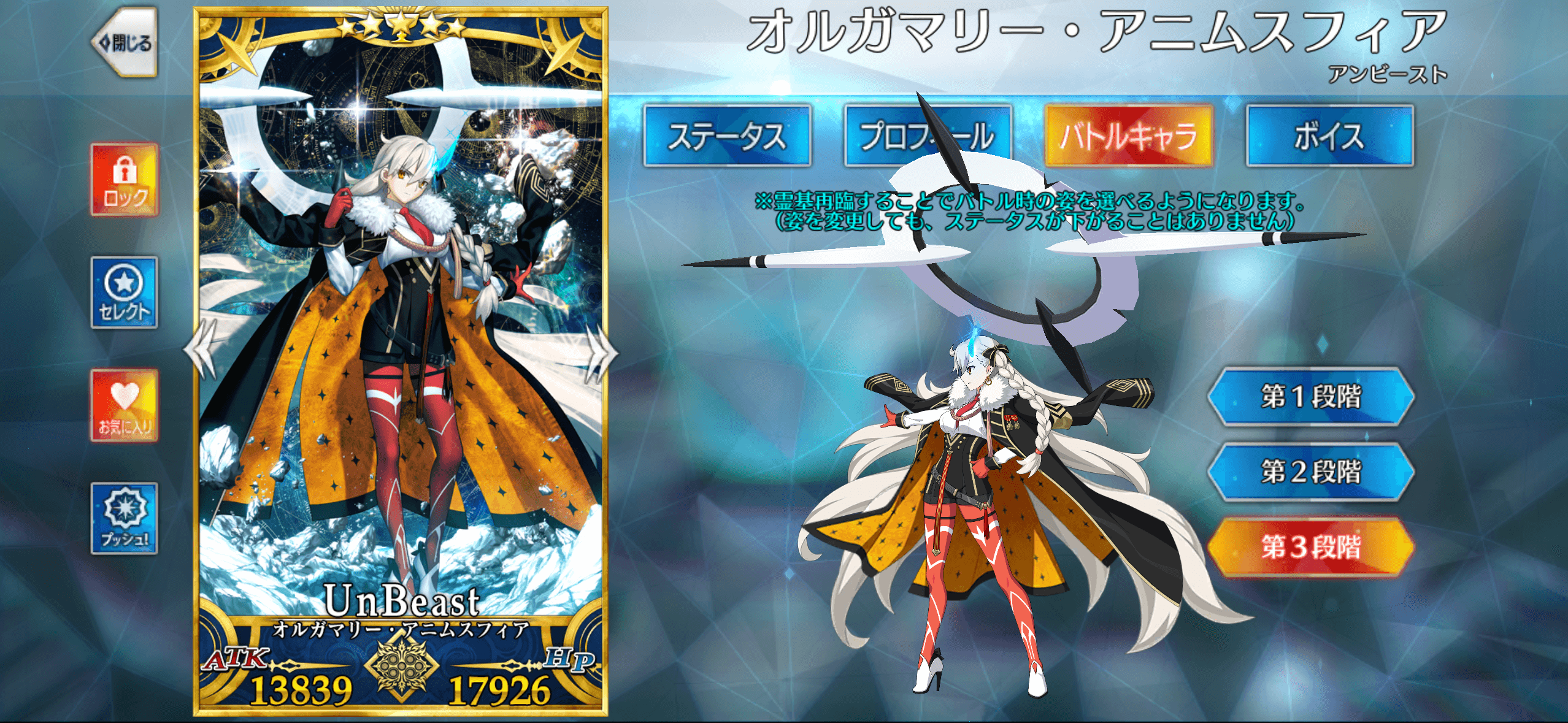 また、地味に再臨1&2では「秩序悪」ですが、再臨3では「秩序善」に変化します。「秩序かつ善」に絆ボーナスが入る「レポートチェック」は再臨3のみ有効です。