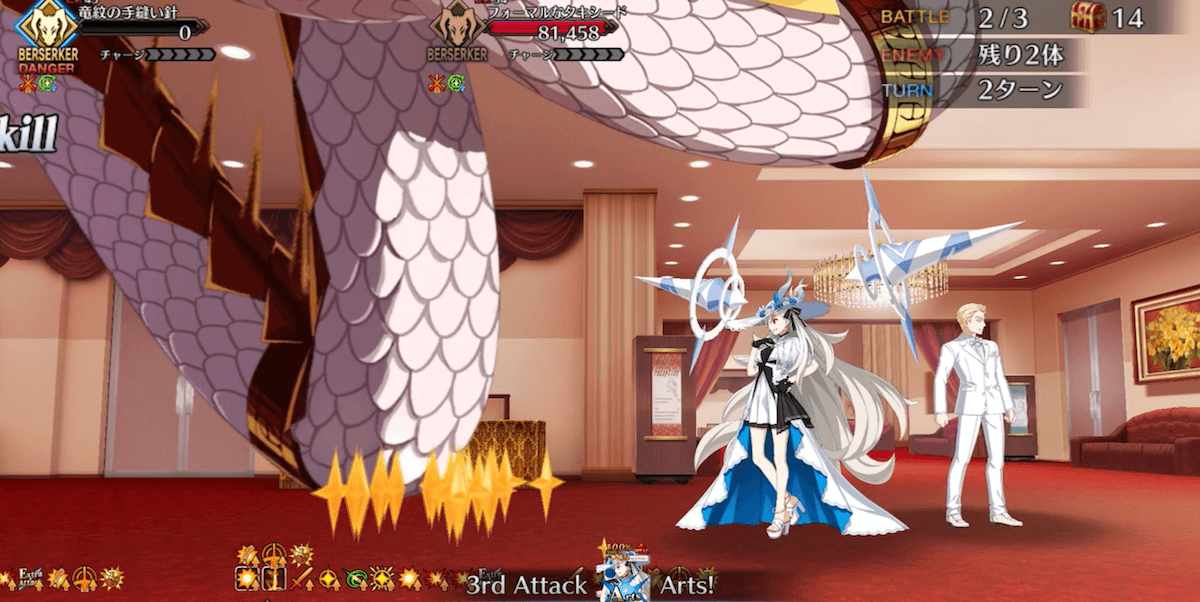 | ダメージ | 【1wave】 32,838(手持ちマリー)【2wave】 64,883(フレンドマリー)【3wave】 228,234(マシュパラディン) |