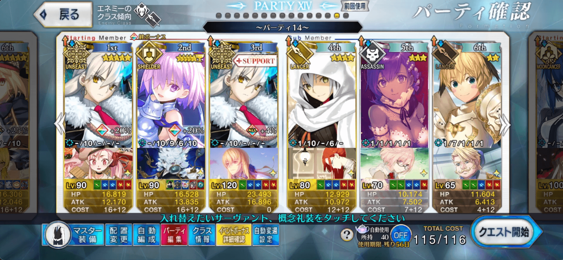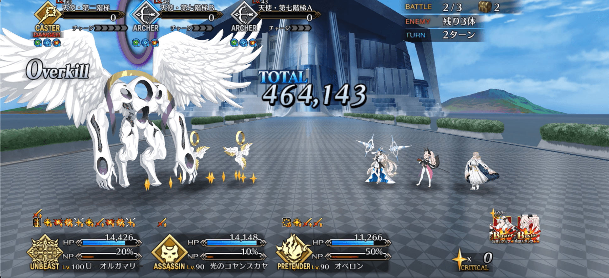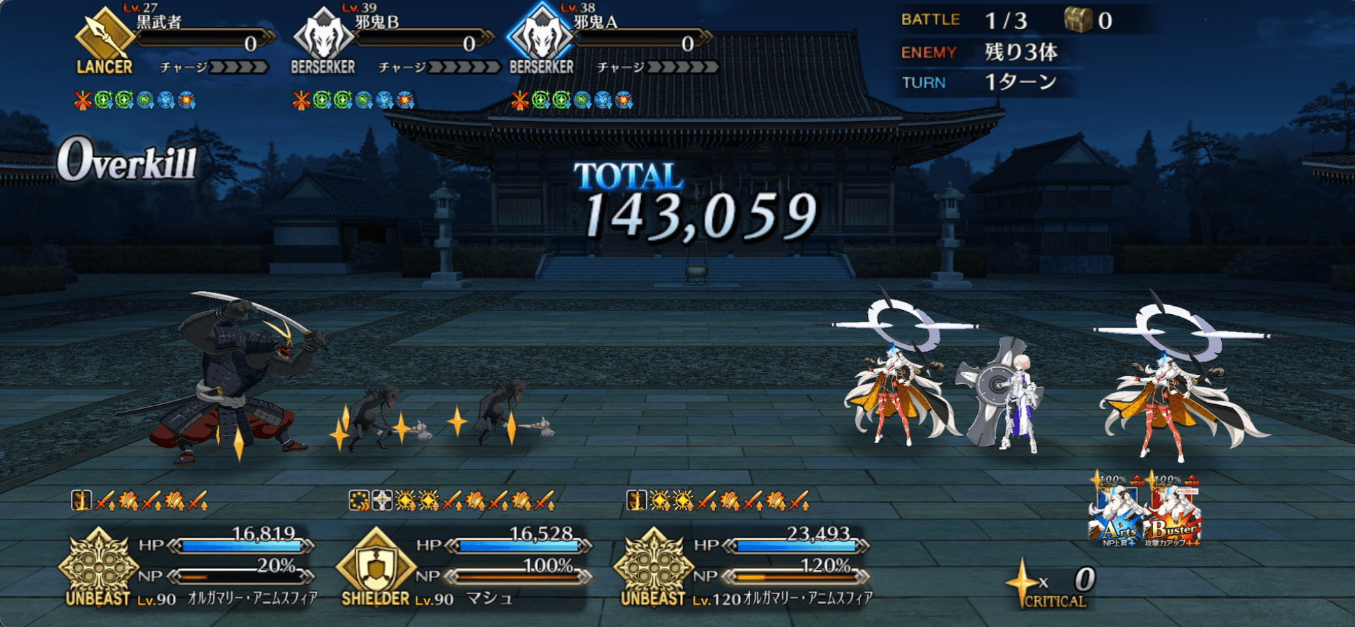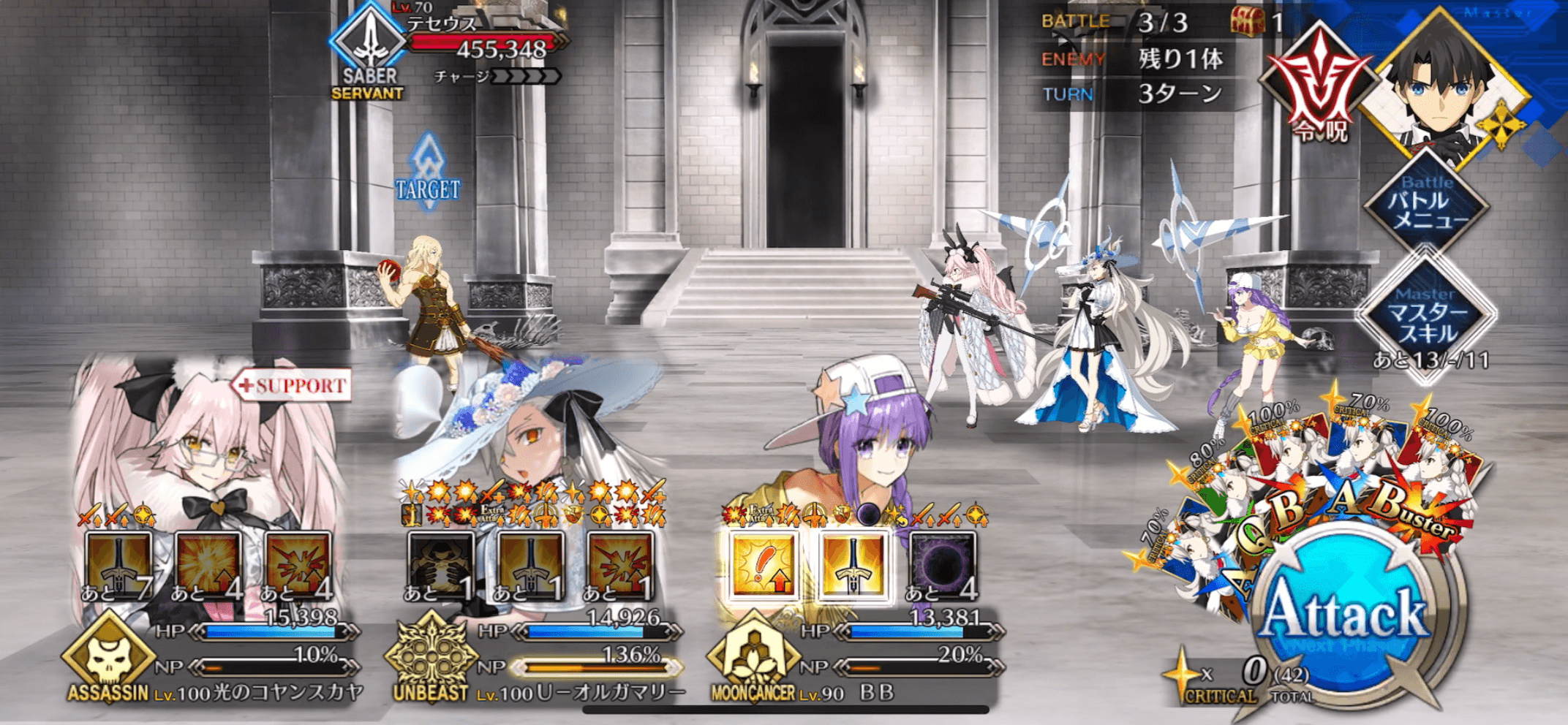 1-3-1、1-1-2、3-1-1などのエネミー構成でカード固定によるクリティカル周回を試したところ、システムや横並べよりも一番安定感ありました。ただし、スキル3を一度しか使えない場合、宝具BBで約60万ダメージほどであったため、ボスのHPが80〜100万の90++周回ではあと一歩及ばない可能性があります。