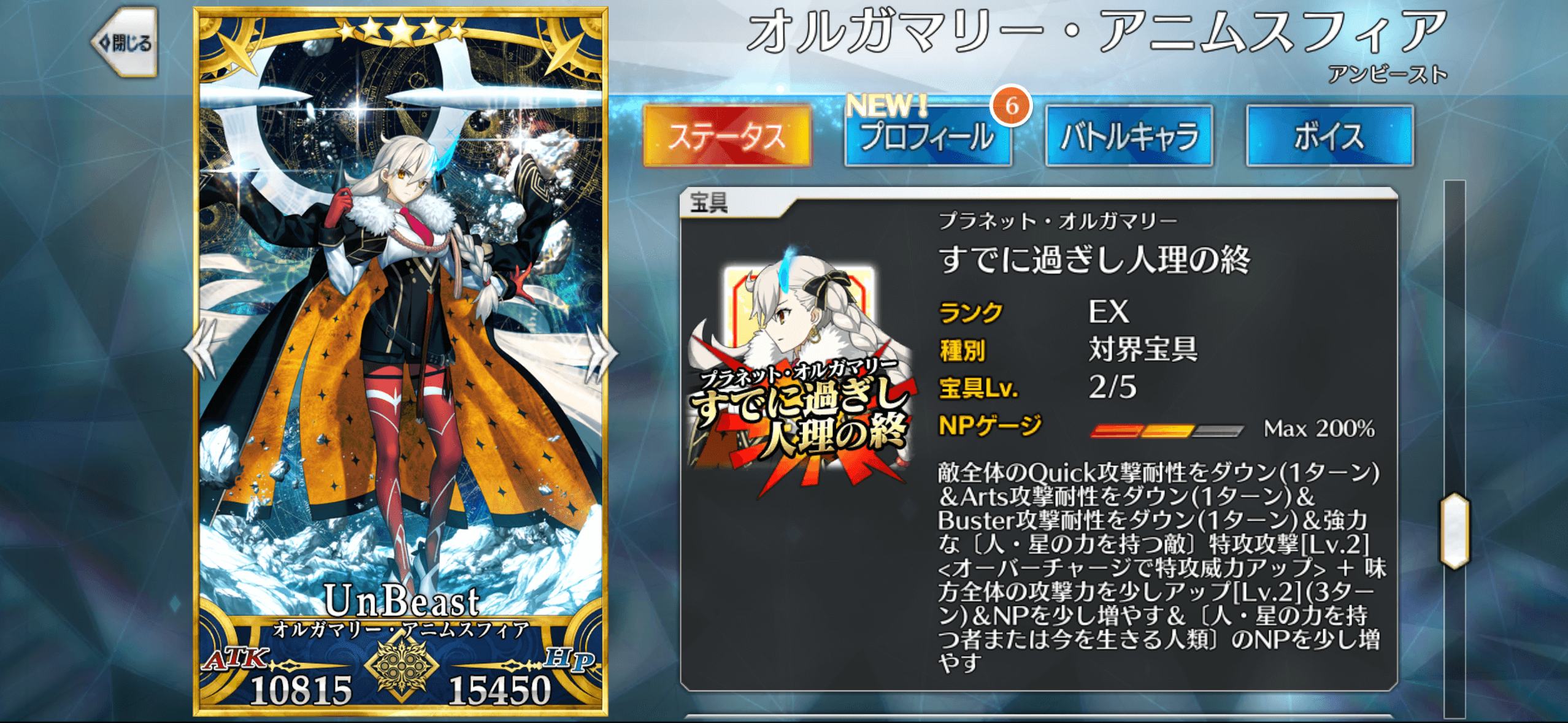 自身の宝具ダメージだけでなく、補助性能目線でも横並べで編成するオルガマリーの宝具はLv5が望ましいです。なぜなら、宝具効果で付与できる、全体攻撃力アップの効果が宝具レベル依存で変化するからです。