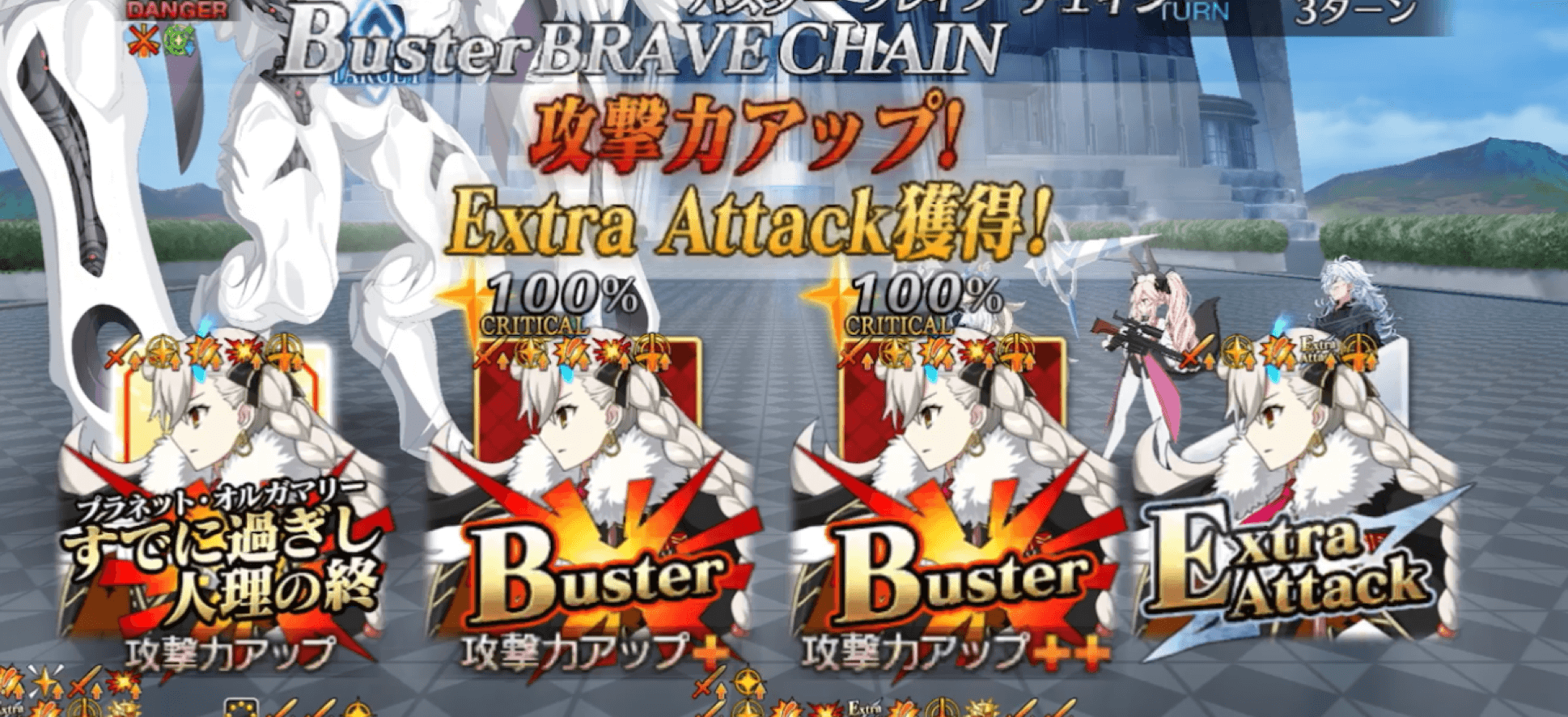 | スキル3 | ①NP100%以上で使用でき自身のNPを減らす【デメリット】(300%) ②〔エクストラクラス〕特攻状態を付与(1T/30%~50%) ③味方全体のバスター性能をアップ(3T/20%~30%) ④Extra Attackカード性能をアップ(3T/50%~100%) ⑤クリ威力をアップ(3T/20%~30%) ⑥NP獲得量をアップ(3T/30%~50%) ⑦無敵状態を付与(1回/3T) ⑧弱体無効状態を付与(3T) |