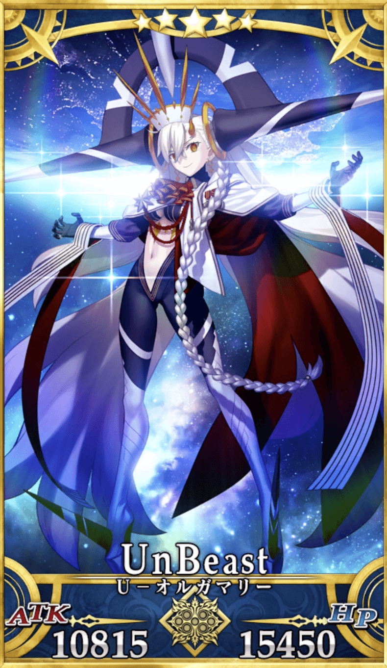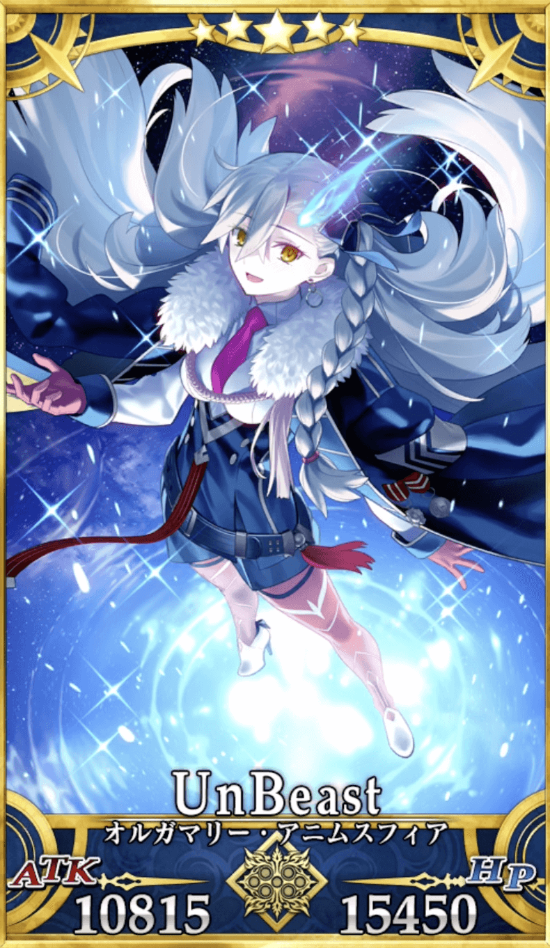 | 宝具 | ・敵全体のクイック耐性をダウン(1T)<20%> ・アーツ耐性をダウン(1T)<20%> ・バスター耐性をダウン(1T)<20%> ・Lv強力な攻撃<300%~500%> ・OC〔人・星の力を持つ敵〕特攻<150%~200%> ・Lv味方全体の攻撃力をアップ(3T)<10%~30%> ・NPを増やす<10%> ・「星・人か今を生きる人類」特性持ちのNPを増やす<10%> |