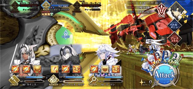 | スキル | ①自身の攻撃力をアップ(2T/20%~40%) ①「通常攻撃でダメージ前に通常攻撃の攻撃力アップ(1T)付与」の状態付与(3T/3回/10%~20%) ②「通常攻撃で敵単体に攻撃力ダウン(1T)付与」の状態付与(3T/3回/10%) ③毎ターンスター獲得状態を付与(3T/5個~15個) ④NPを増やす(20%) ①自身に被ダメージカット状態を付与(3T/3回/2,000~3,000) ②ガッツ状態を付与(3T/1回/1,000~3,000) |