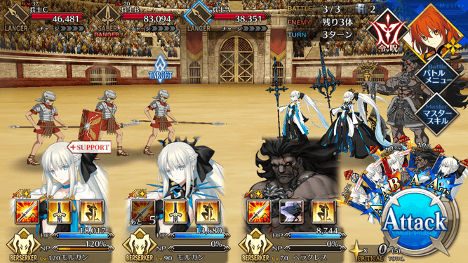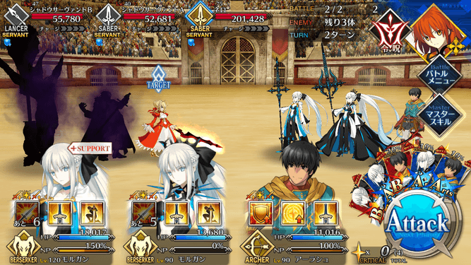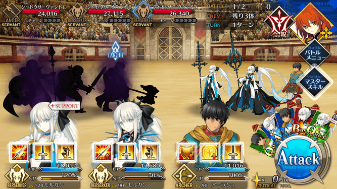| スキル | ①自身の攻撃力をアップ(3T/10%~30%) ②防御力がダウン【デメリット】(3T/10%) ①自身に60%の確率で攻撃力アップを付与(3T/20%~40%) ②60%の確率で防御力アップを付与(3T/20%~40%) ③HPを回復(1,000~3,000) ①自身のバスター性能をアップ(1T/30%~50%) ②HPが減少【デメリット】(500) |