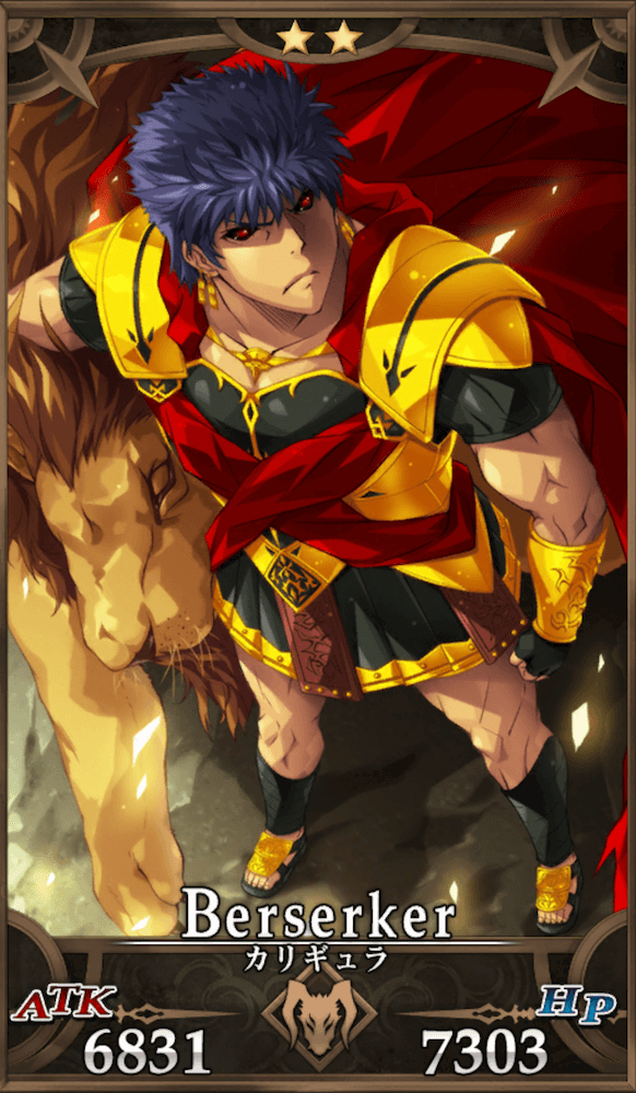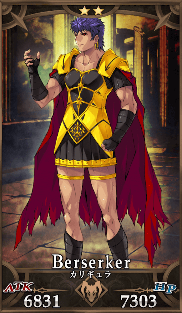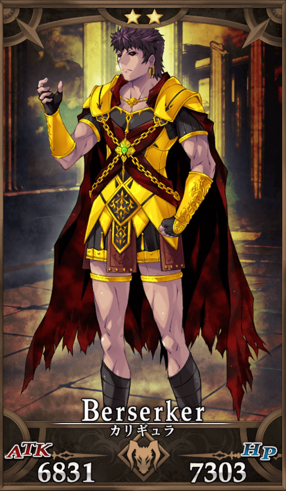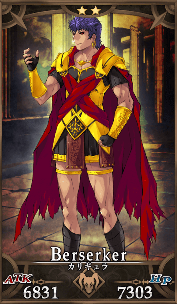 カリギュラは宝具封印とスキル封印を同時に付与するデバフ型全体宝具と、耐久を捨てた火力特化型スキルが特徴のバーサーカー。短命なアタッカーとして運用する以外にも、耐久面をサポートして宝具を活かしたデバッファーとして敵の動きを妨害する運用もできる。