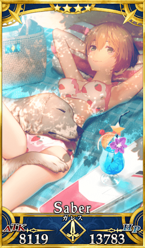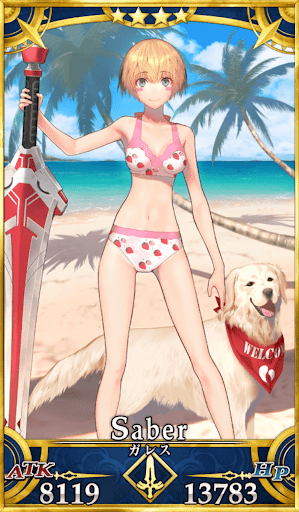 | 水着に着替えて別霊基となったガレス。 最優と謳われるセイバー霊基となるにあたり、重要なモノがある。 そう、剣だ。 ランサー霊基の際には持ち得なかったとっておき、赤き意匠の魔剣! ───爽快抜剣! 真夏限定で魔剣を振るうセイバー・ガレスである。 |