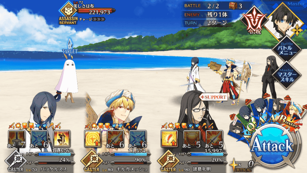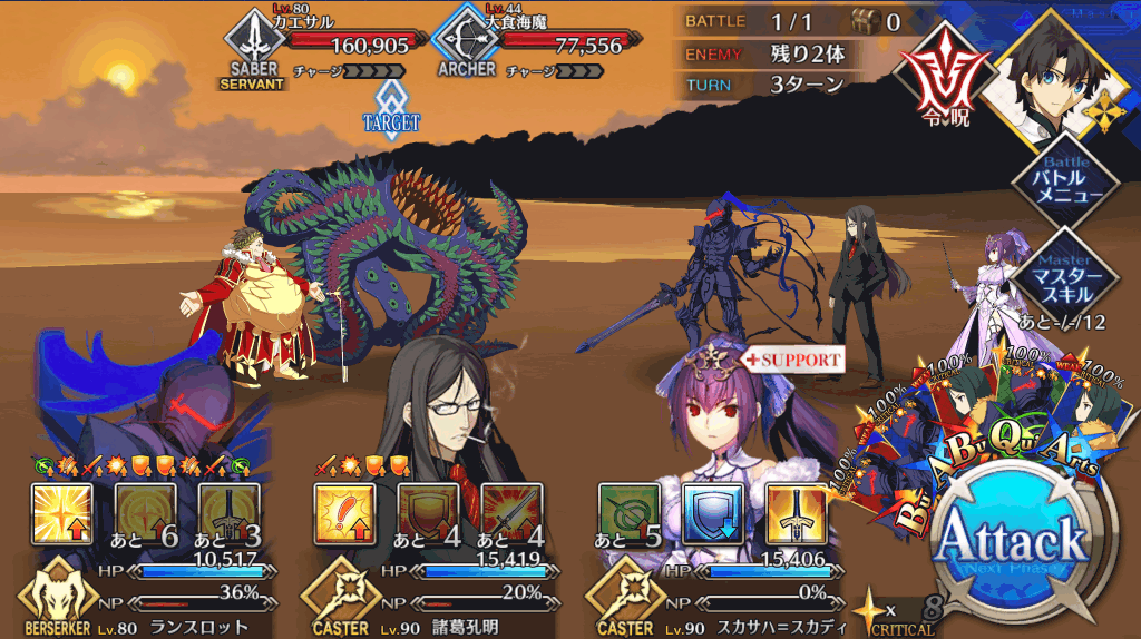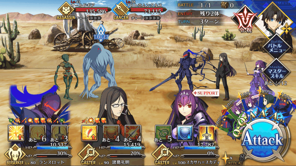 | スキル | ①自身に60%の確率で攻撃力アップを付与(3T/20%~40%) ②60%の確率で防御力アップを付与(3T/20%~40%) ③HPを回復(1,000~3,000) ①自身のNP獲得量をアップ(3T/20%~40%) ②毎ターンNP獲得状態を付与(3T/10%) ③毎ターンHP回復状態を付与(3T/500~1,000) ④NPを増やす(20%~30%) ⑤強化成功率をアップ(3T/20%~40%) ①自身に無敵を付与(1T) ②弱体状態を解除(-) ③スターを獲得(10個~20個) |