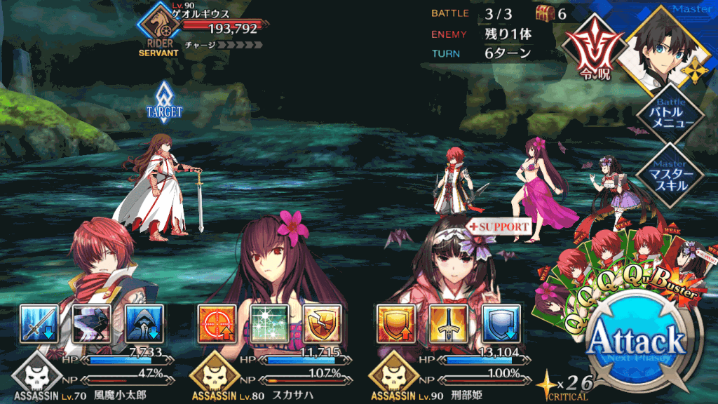 | ①OC自身のバスター性能をアップ(1T)<30%~70%> ②Lv敵全体に強力な攻撃<300%~500%> ③自身のHPが減少【デメリット】<1,000> |