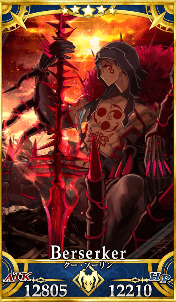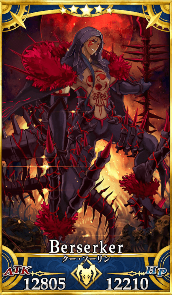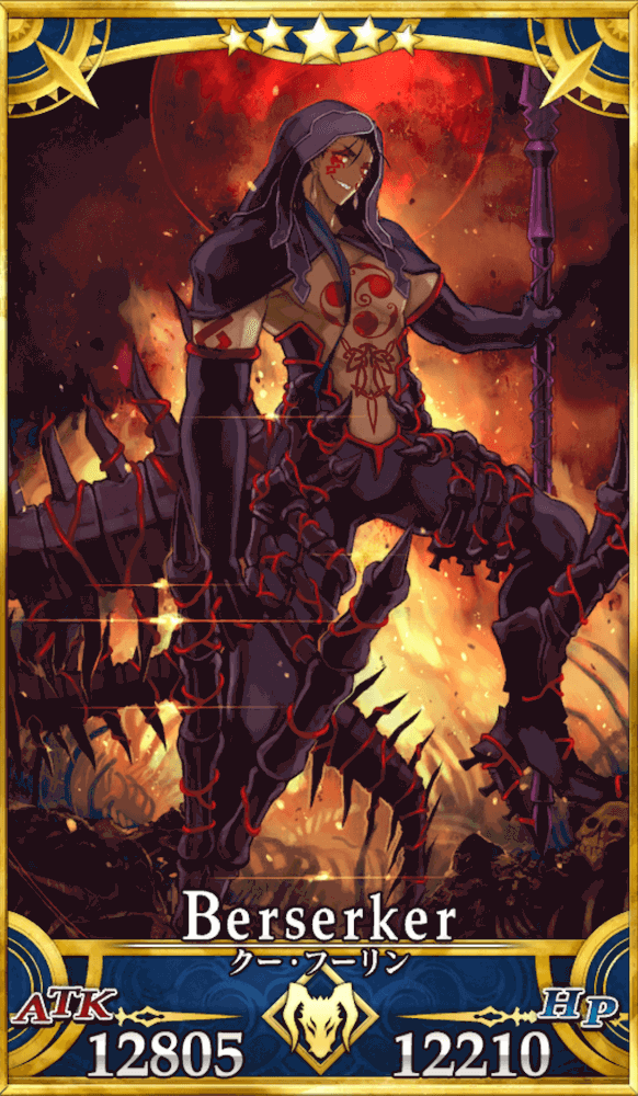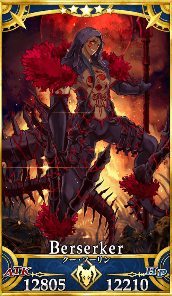 | ケルト・アルスター伝説の勇士。 赤枝騎士団の一員にしてアルスター最強の戦士であり、異界「影の国」の盟主スカサハから授かった無敵の魔槍術を駆使して勇名を馳せた。 通常とは異なりバーサーカーとして現界している。 何らかの要因によって全身の装備が変化し、 性格も反転。表情は冷酷、宝具である魔槍も黒混じりの赤となっており、禍々しい気配を湛えている。 |