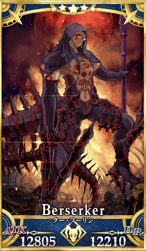 | クー・フーリンが女王メイヴの願望によって 変転した姿。狂王クー・フーリンとして アメリカの大地を食い荒らした。 生前の狂戦士状態ですらない、 本来のバーサーカーとはまた異なる姿での召喚。 聖杯のバックアップを受けていた時はランサー、あるいはキャスターの状態よりも強さでは上回っていた。 |