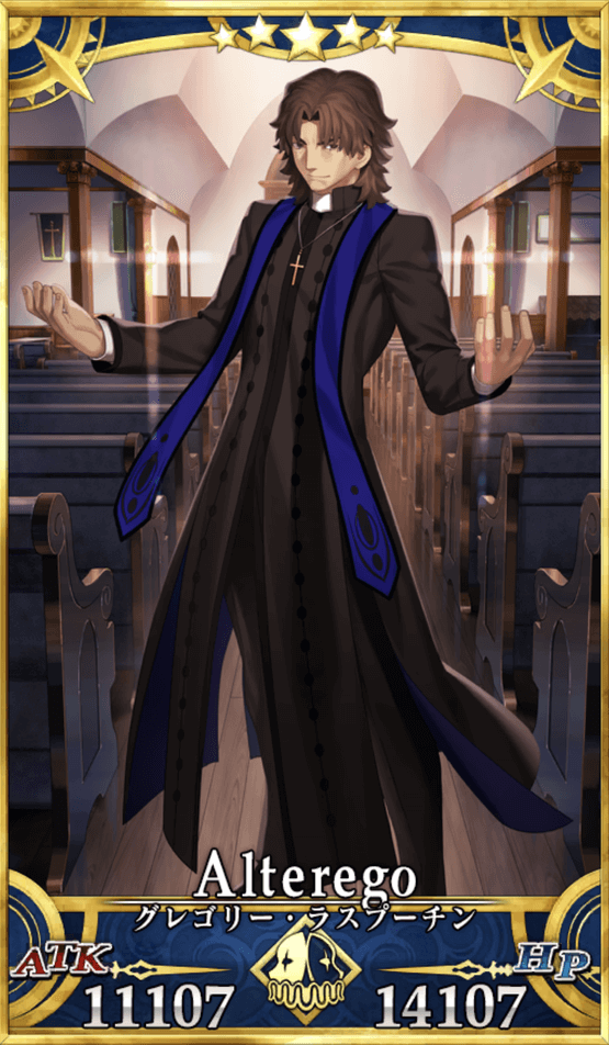 | ある神父の体を依り代に、『異星の神』が召喚、サーヴァント化した疑似サーヴァント。 ロシアに名高い怪僧ラスプーチンとして現れ、以後、幾度となくカルデアと交戦した。 ある時は敵、ある時は中立、ある時は味方として振る舞う、この人物の真意とは――― |