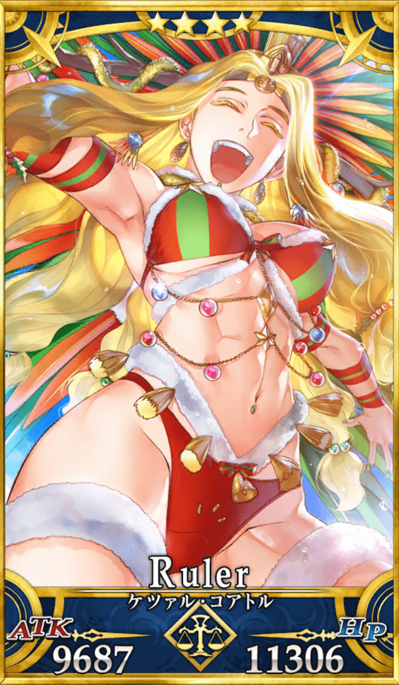 | 身長/体重:181cm・64kg 出典:アステカ神話 地域:中南米 属性:秩序・善 副属性:天 性別:女性 ステータスはプレゼント配りとサンバのために最適化されてマース! |