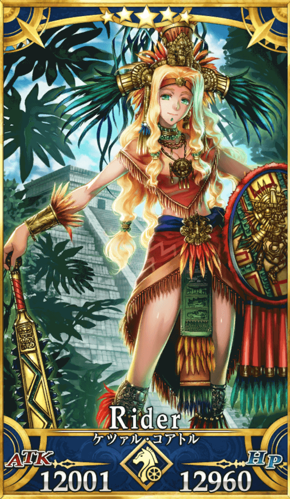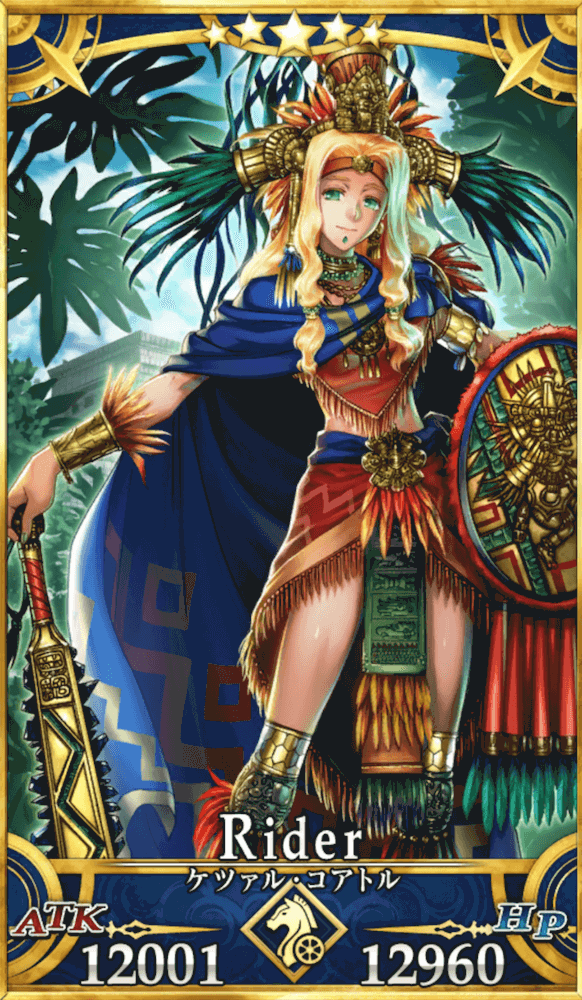 | 身長/体重:181cm・64kg 出典:アステカ神話 地域:中南米 属性:秩序・善 性別:女性 分霊のひとつにサーヴァントとしての形を与えて 現界している。 |