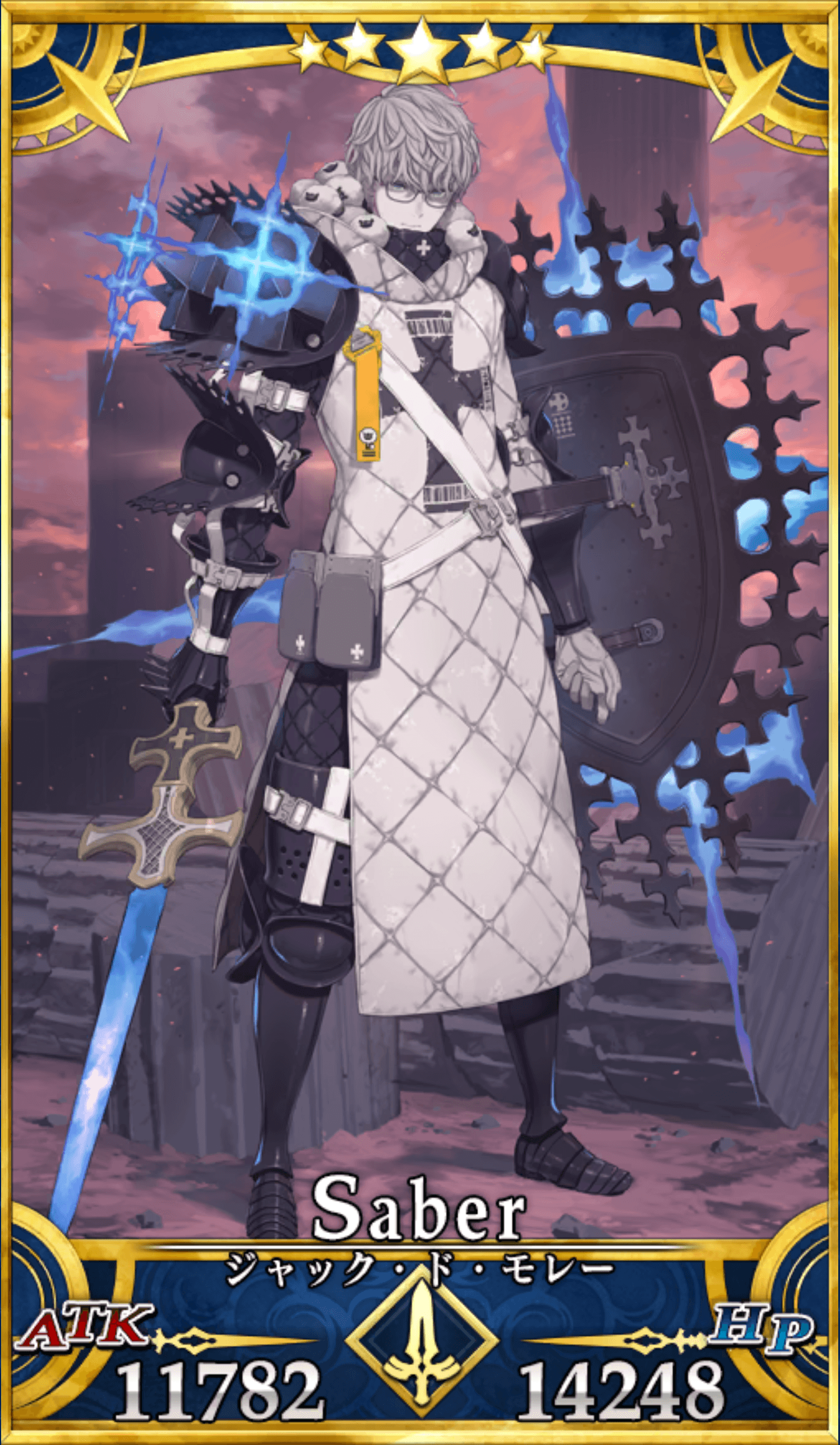 | クラス“セイバー”のジャック・ド・モレーは、敬虔なる修道士にして騎士。 テンプル騎士団が何世紀にもわたり理不尽に被ってきた汚名が雪がれて以降の歴史観のサーヴァントである。 シテ島での火刑の際には、確かに呪いの言葉を吐いた。しかしサーヴァントとなったモレーには、結局のところ衰亡の道を辿ったフランス王家に対して、憐れみはあれど憎しみはない。 ただ貸したお金を返して欲しい。それだけである。 |