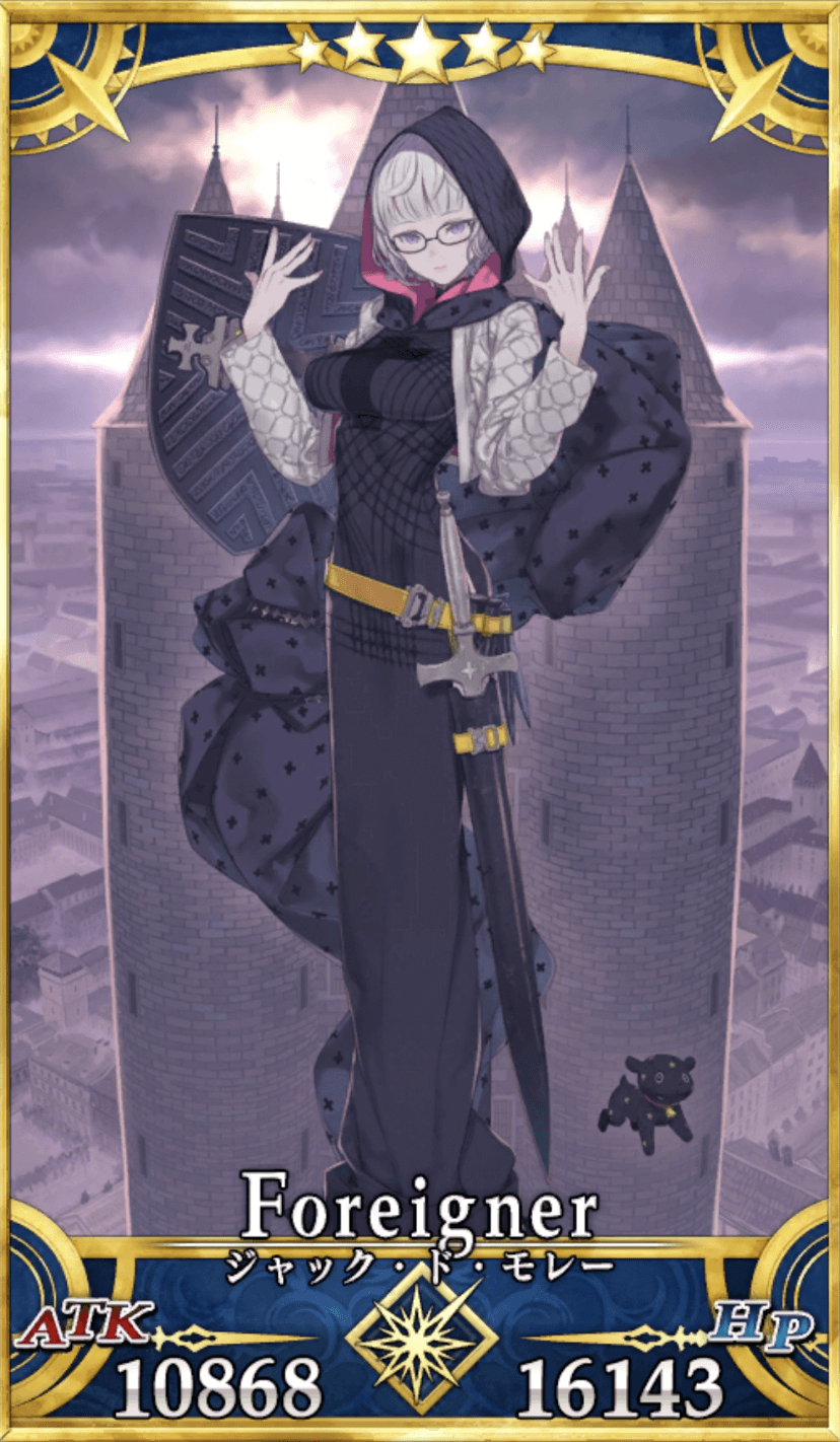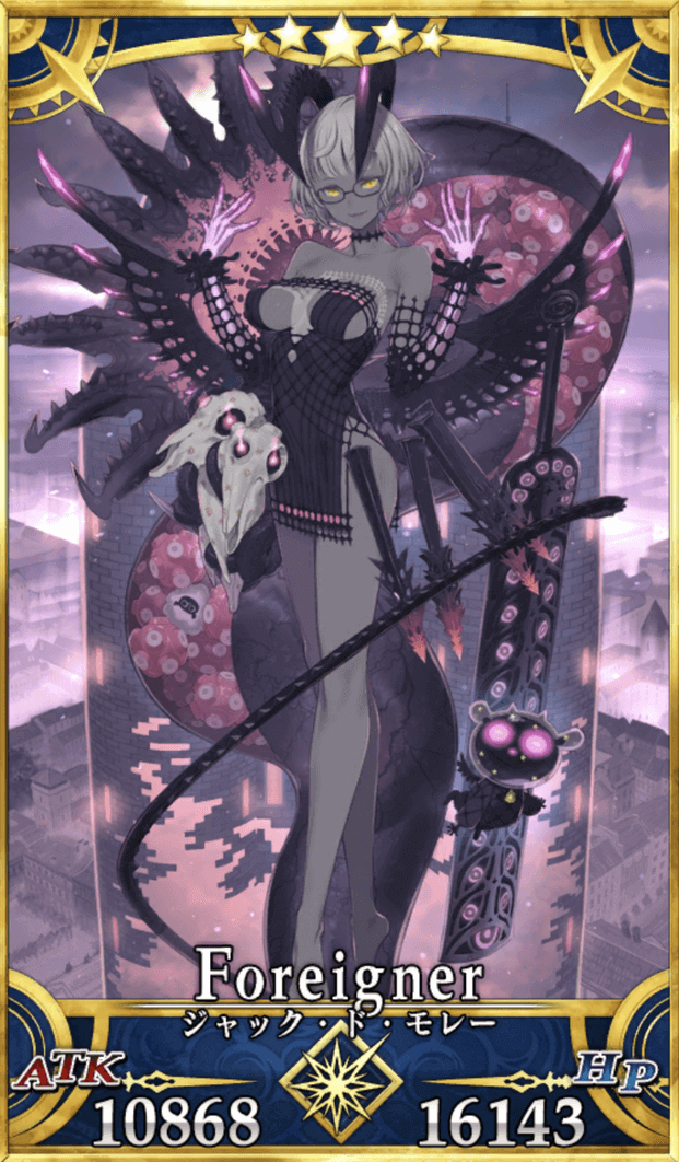 | フォーリナーのジャック・ド・モレーは、騎士団を羨む権力者や民衆が広めた醜聞と汚名により霊基の変質した無辜の英霊。 さらには人類の堕落を欲す“深淵の聖母”と称される邪神が憑くことで、その悪性をブーストしている。 ちなみに不吉の象徴『13日の金曜日』は騎士団が一斉摘発された事件日に由来すると流伝される。 |