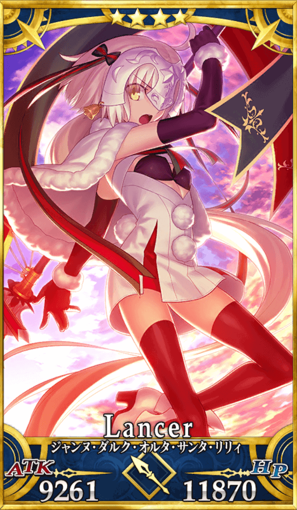 | 『優雅に歌え、かの聖誕を』 ランク:A+ 種別:対軍宝具 レンジ:1~10 最大捕捉:10人 ラ・グラスフィーユ・ノエル。 吼え立てよ、我が憤怒と対を為し、ジャンヌ・オルタ・サンタ・リリィがノリノリになったときに発動する聖歌宝具。 悪い子にはお説教(ダメージ)を、良い子には贈り物(バフ)を。 雪の如く降り積もる贈り物は、クリスマスを待つ子供たちに大受けだとか何とか。 なお、歌う必要は特にない。 |