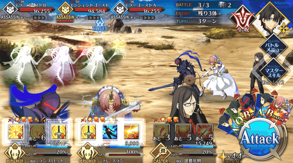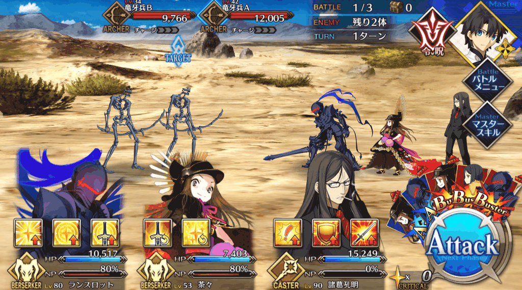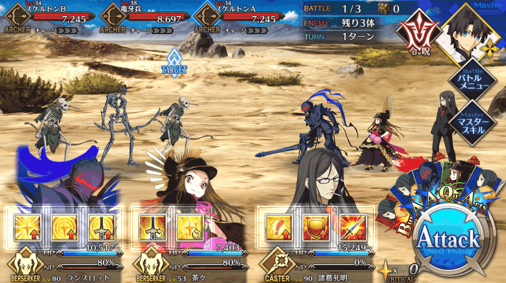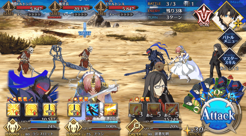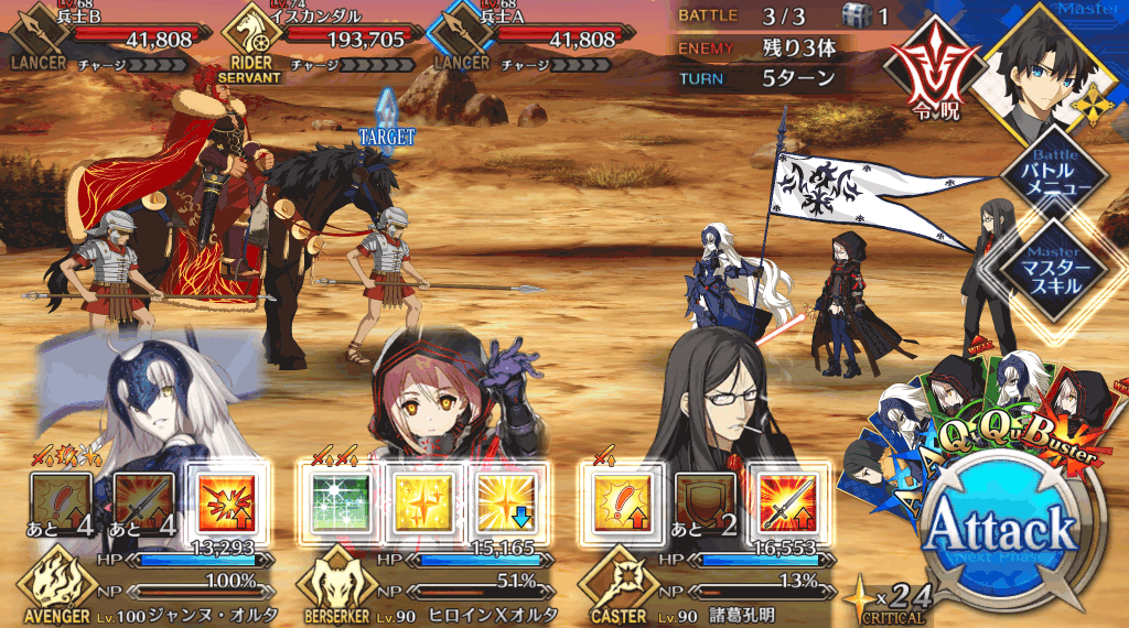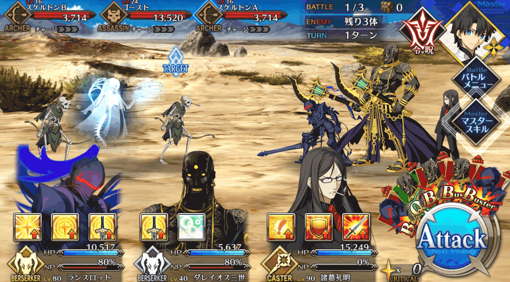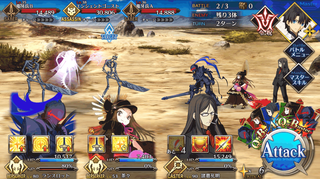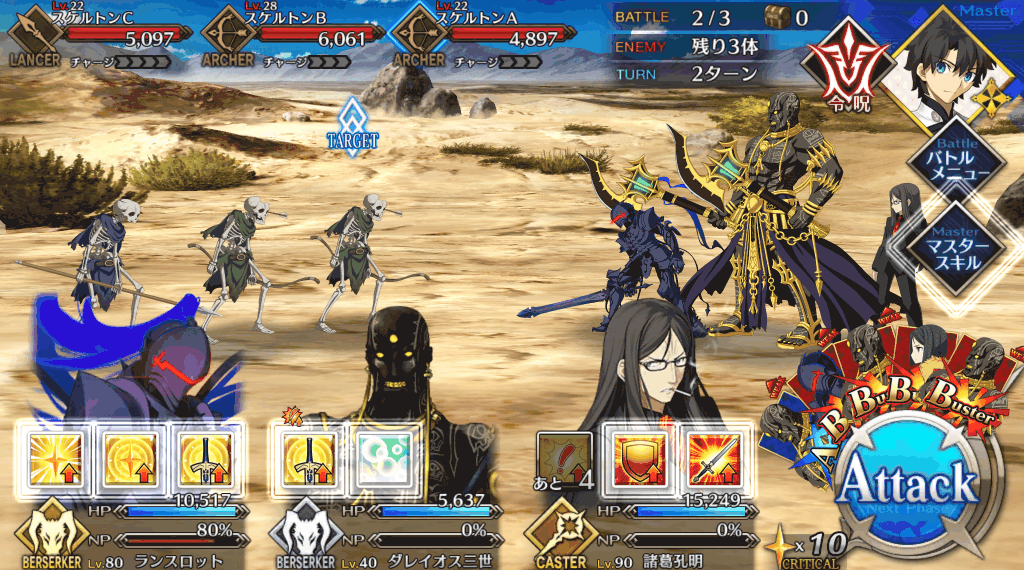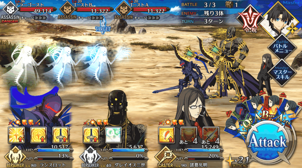 | 宝具 | ・Lv敵全体に強力な攻撃<400%~600%> ・OC攻撃力をダウン(3T)<10%~30%> ・OC防御力をダウン(3T)<10%~30%> |