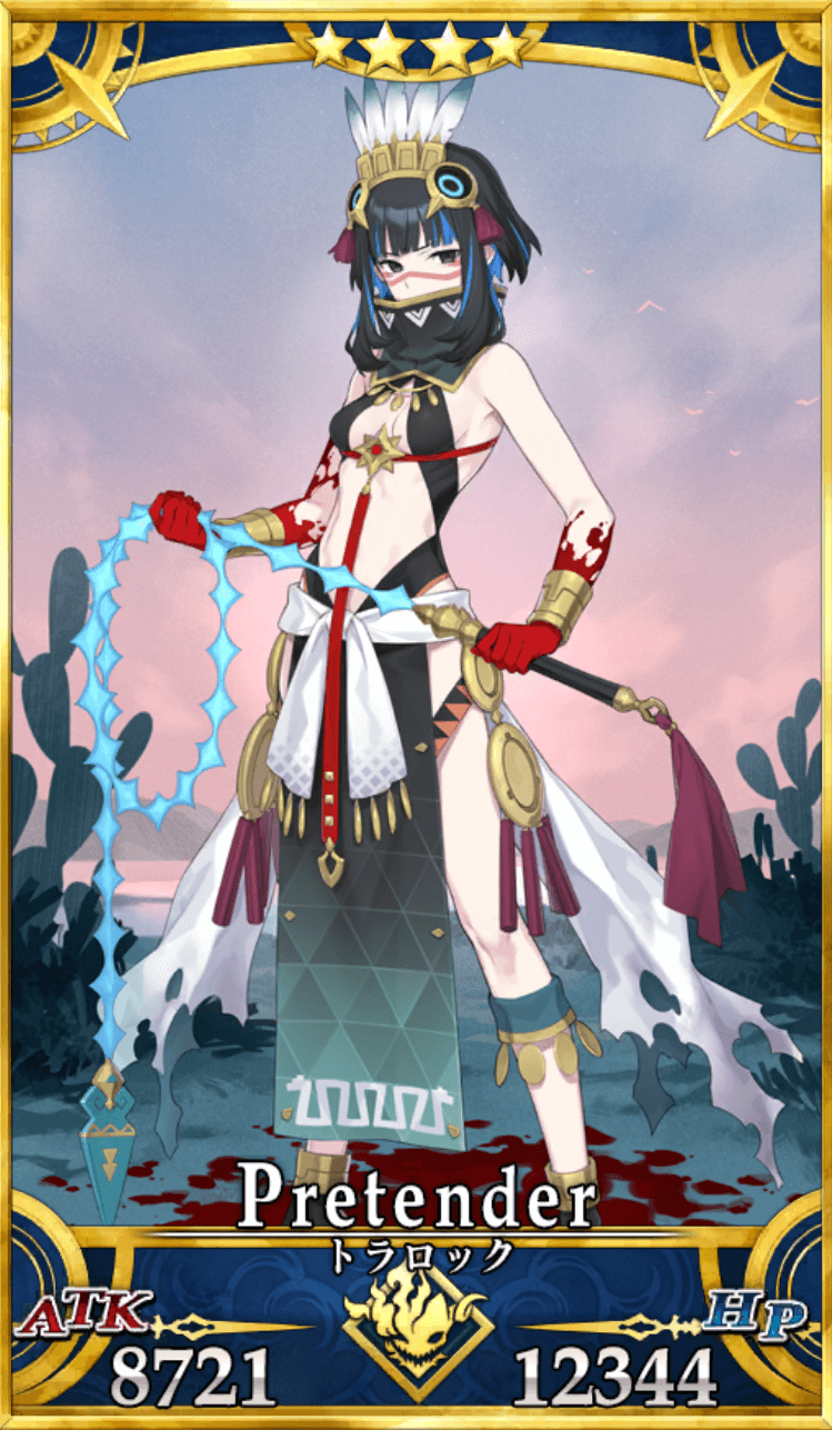| トラロック神、そしてウィツィロポチトリ神を名乗る謎のサーヴァント。 トラロックはアステカ神話における雨の神で、創世において三番目の世界を支配したが、炎の雨によって滅びてしまった、という逸話を持つ。 ウィツィロポチトリはアステカの民の部族神で、戦の神にして太陽の化身と呼ばれている。 |