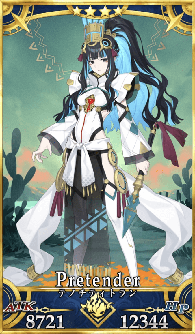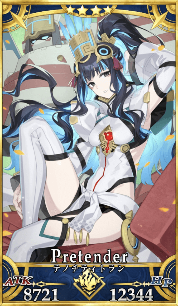 | ○陣地作成:EX 都市の擬人化であるテノチティトランの陣地作成は最高ランクのものである。 ○神性:A+ 二つの神性を持つため、とても高い。 ○水辺の営み:A+ 最高峰の水上都市としての矜持、誇り。 ○都市国家同盟:A アステカ帝国とは、テノチティトラン、テスココ、トラコパンの三都市同盟による共同体であった。 ○第三の太陽:A 雨の神トラロックが支配した世界(第三の太陽ナウイ・キアウィトル)を創造する。 ○花の戦争:A ショチヤオヨトル。都市国家を存続させるためには他部族との戦争、そして奴隷の獲得は必須であった。 テノチティトランの神殿には心臓を抜かれた生贄たちの血の跡が続き、その活力によって彼らの世界(太陽)は守られたという。 ○月の湖:EX メストリアパン。放浪のアステカ人たちが辿り着いた安住の地、後にテノチティトランが築かれる湖の名。 人類に安息と繁栄をもたらす“人理”の収束点。ようはパワースポット。 地上にありながら星の内海と同じ霊脈を持つ。 パーティ全体に高い物理カットを付加し、テノチティトラン自体は超パワーアップする。 |
