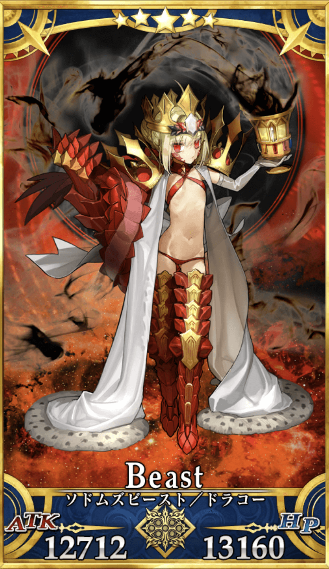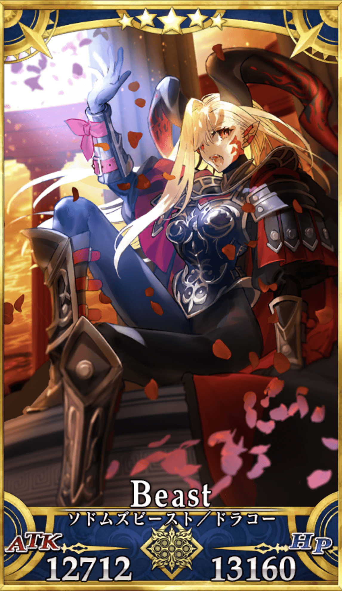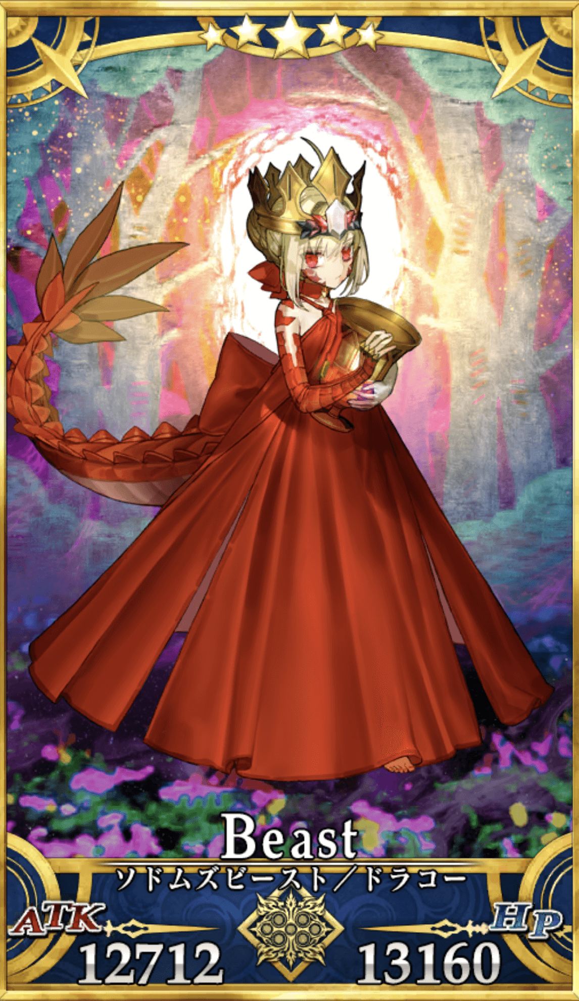 | 特性 | 獣属性、混沌、悪、女性、人型、ローマ、竜、王、アルトリア顔、ケモノ科、子供のサーヴァント、ギルガメッシュ宝具特攻対象外 | |