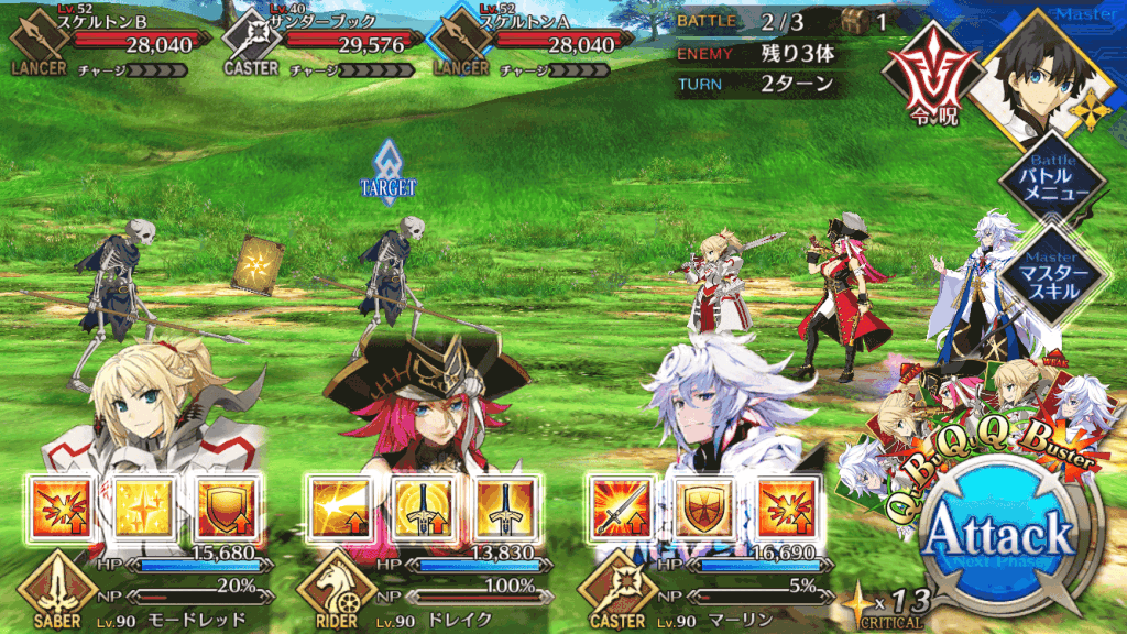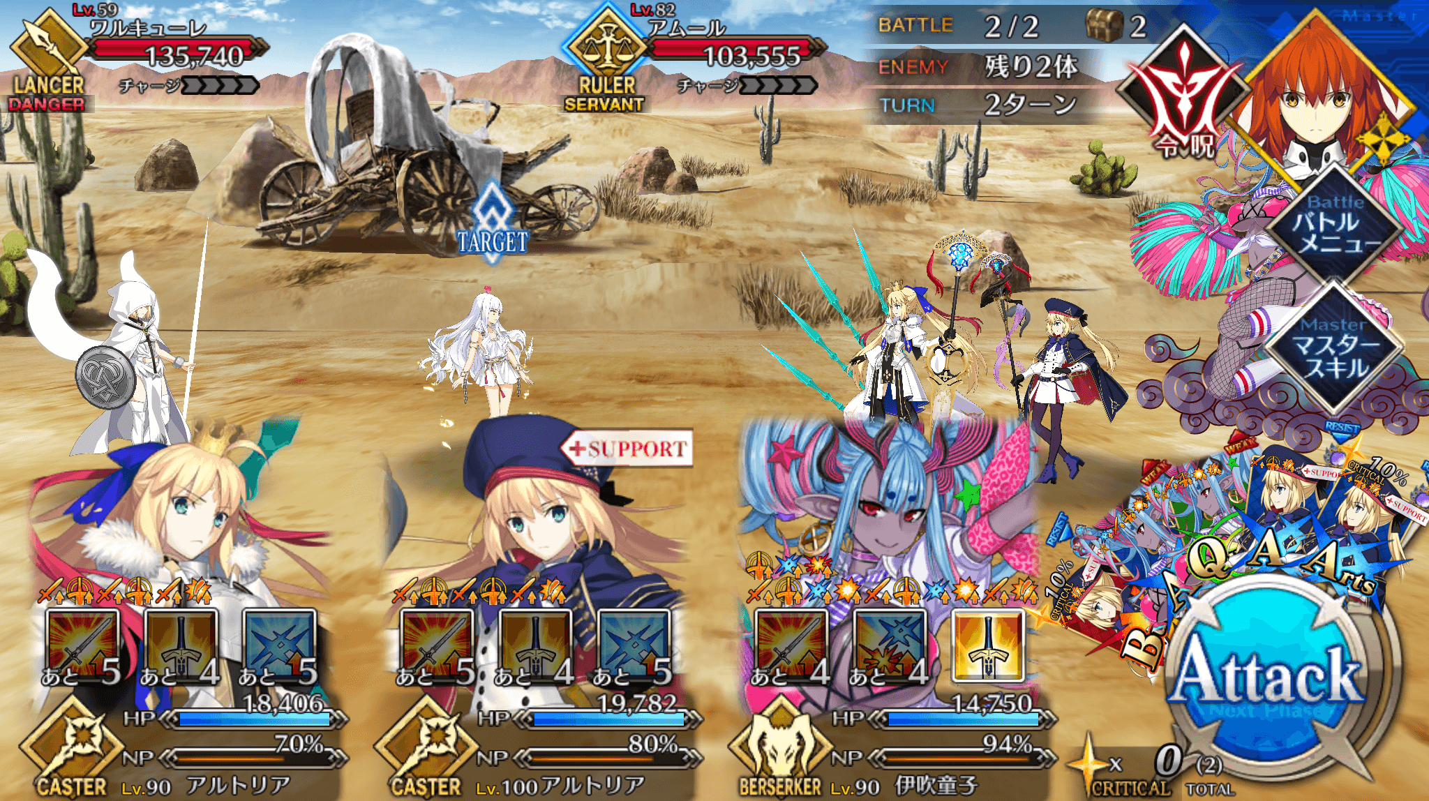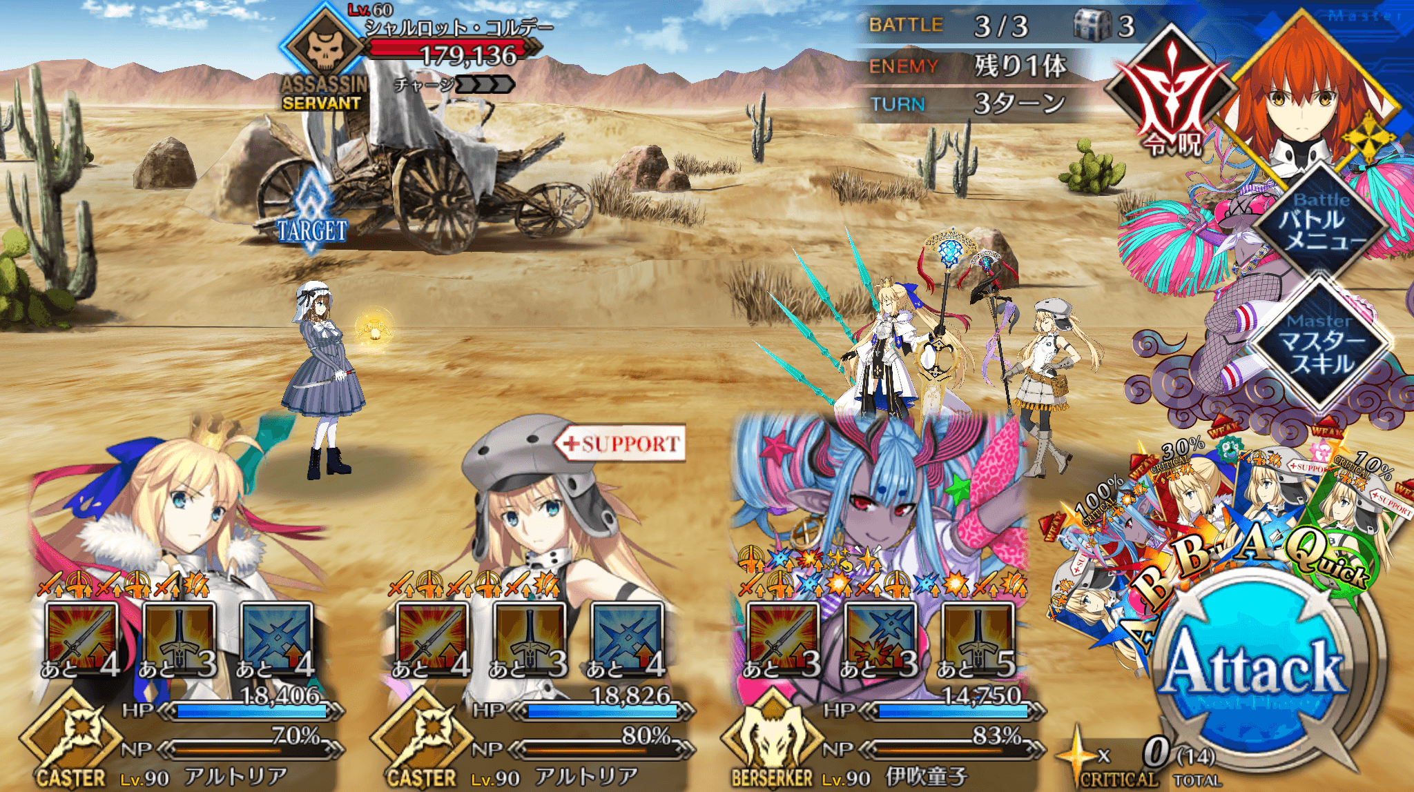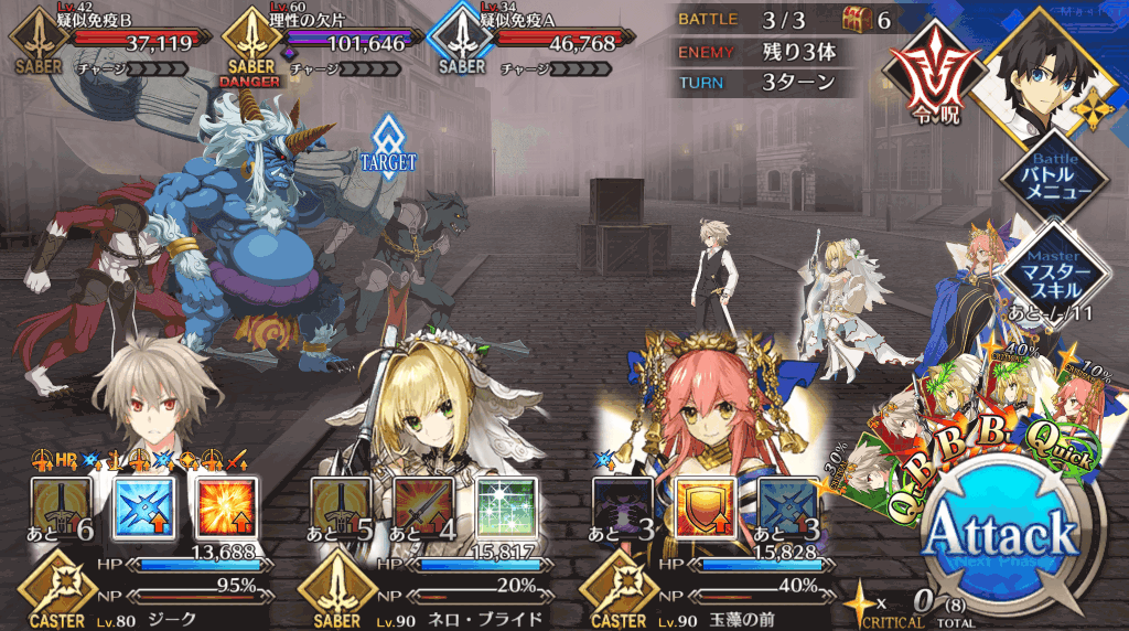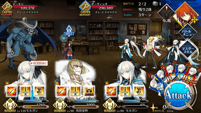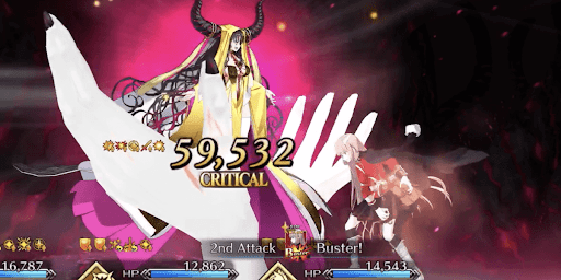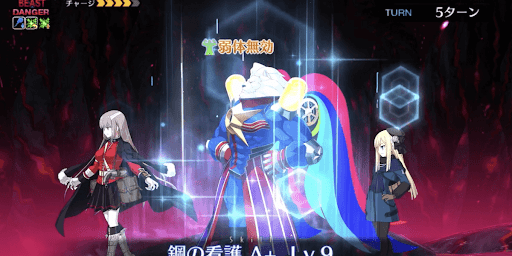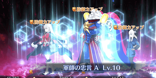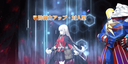 | スキル | ①味方単体のHPを回復(2,000~4,000) ②弱体無効状態を付与(3T/3回) ③即死無効状態を付与(3T/1回) ①自身に〔人型〕特攻を付与(3T/30%~50%) ②〔人型〕特防を付与(3T/15%~25%) ①味方単体のバスター性能をアップ(3T/30%~50%) ②バスターカードのクリ威力をアップ(3T/20%~30%) ③スターを獲得(10個~20個) |