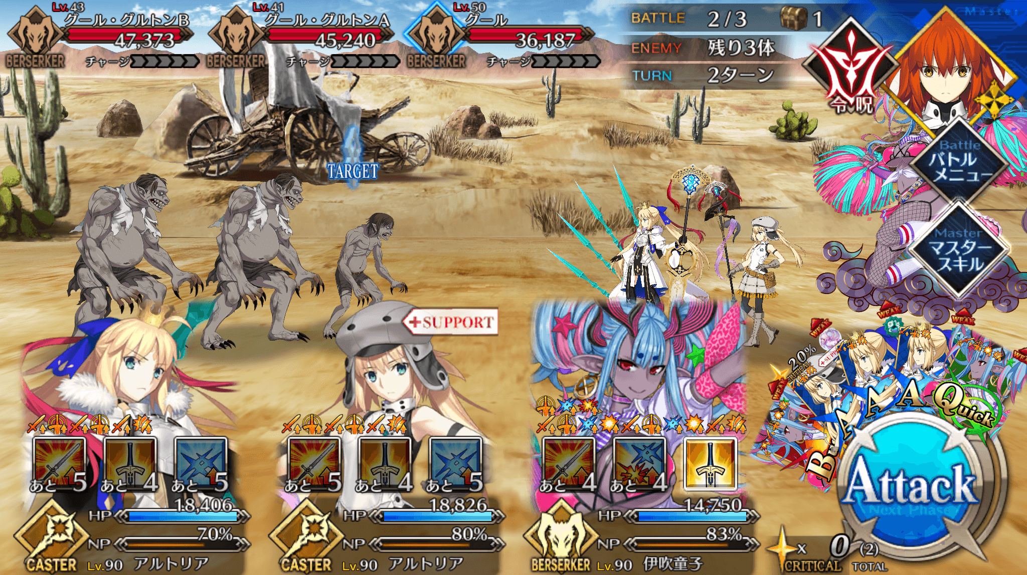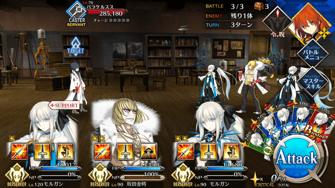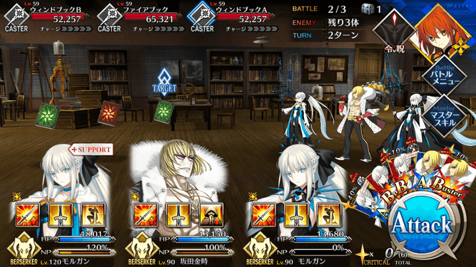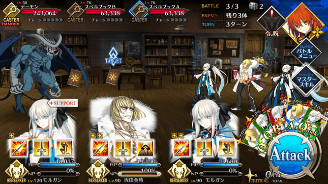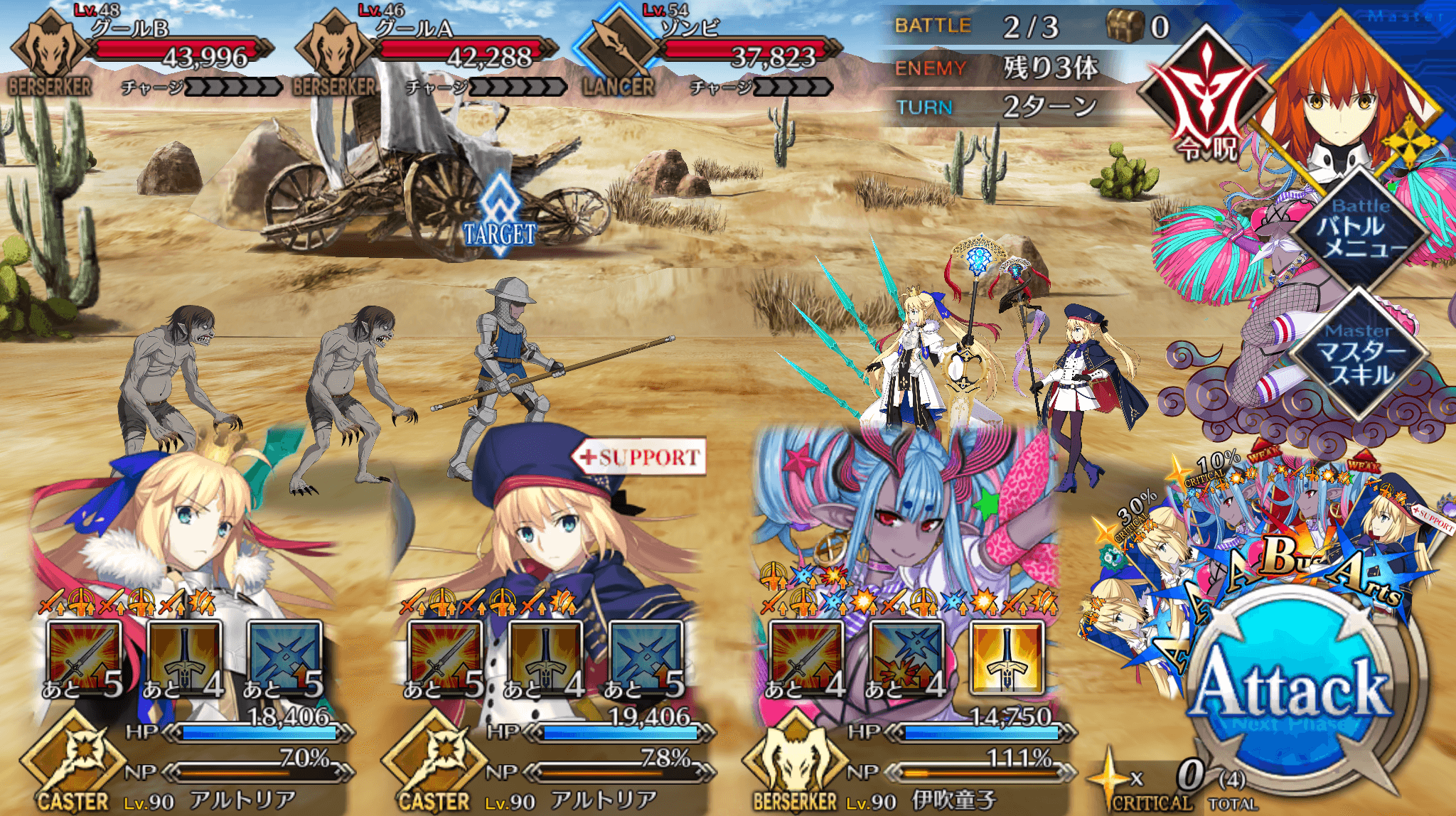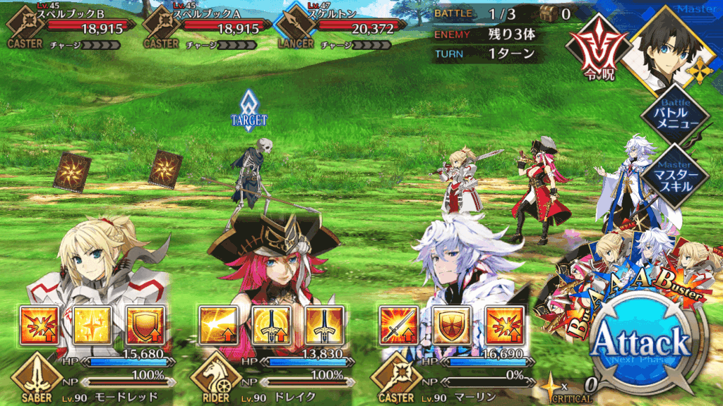 | スキル | ①味方単体のHPを回復(2,000~4,000) ②弱体無効状態を付与(3T/3回) ③即死無効状態を付与(3T/1回) ①自身に〔人型〕特攻を付与(3T/30%~50%) ②〔人型〕特防を付与(3T/15%~25%) ①味方単体のバスター性能をアップ(3T/30%~50%) ②バスターカードのクリ威力をアップ(3T/20%~30%) ③スターを獲得(10個~20個) |