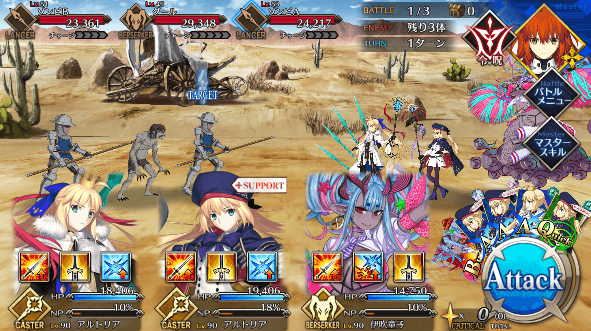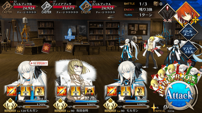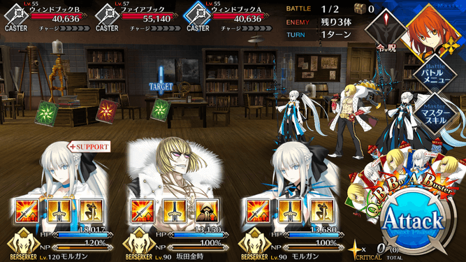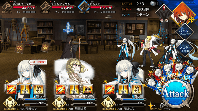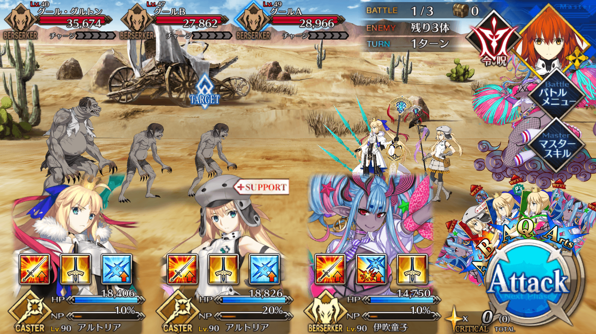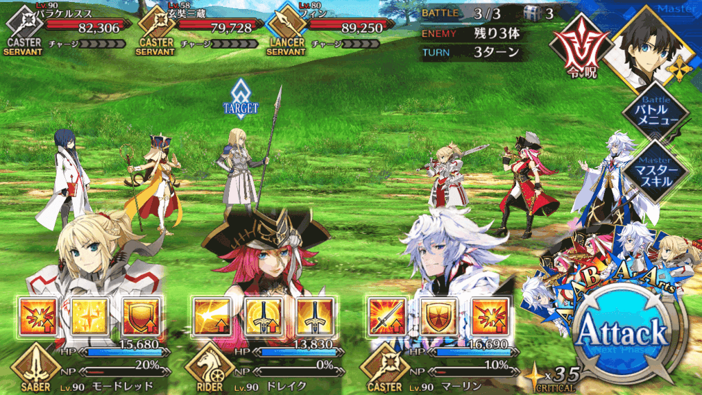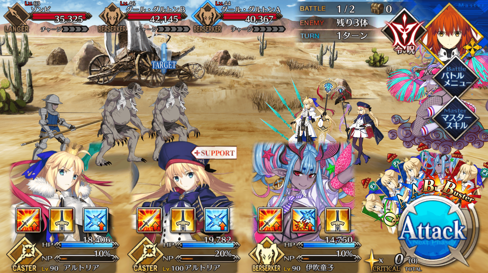 | スキル | ①味方単体のHPを回復(2,000~4,000) ②弱体無効状態を付与(3T/3回) ③即死無効状態を付与(3T/1回) ①自身に〔人型〕特攻を付与(3T/30%~50%) ②〔人型〕特防を付与(3T/15%~25%) ①味方単体のバスター性能をアップ(3T/30%~50%) ②バスターカードのクリ威力をアップ(3T/20%~30%) ③スターを獲得(10個~20個) |