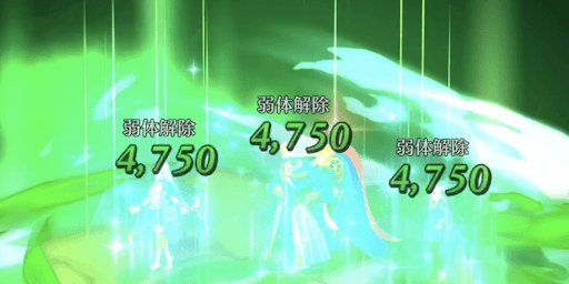 | ①OC敵全体の宝具威力をダウン(1T)<50%~100%> ②味方全体の弱体状態を解除<-> ③LvHPを回復<3,000~5,000> |
