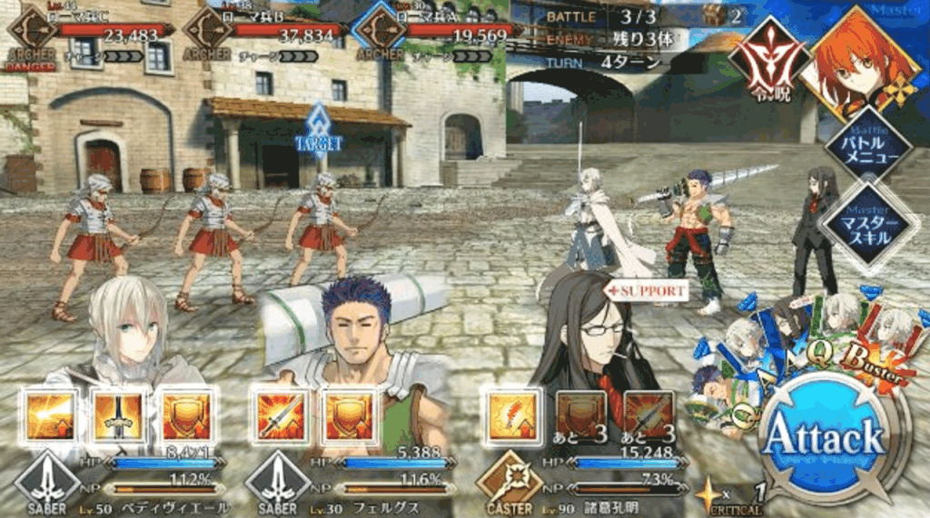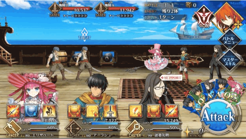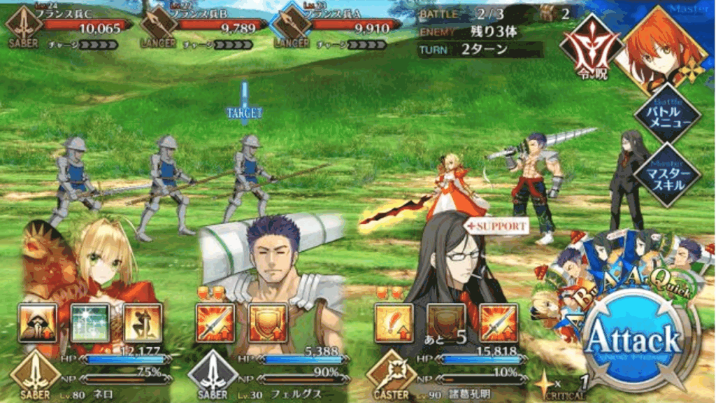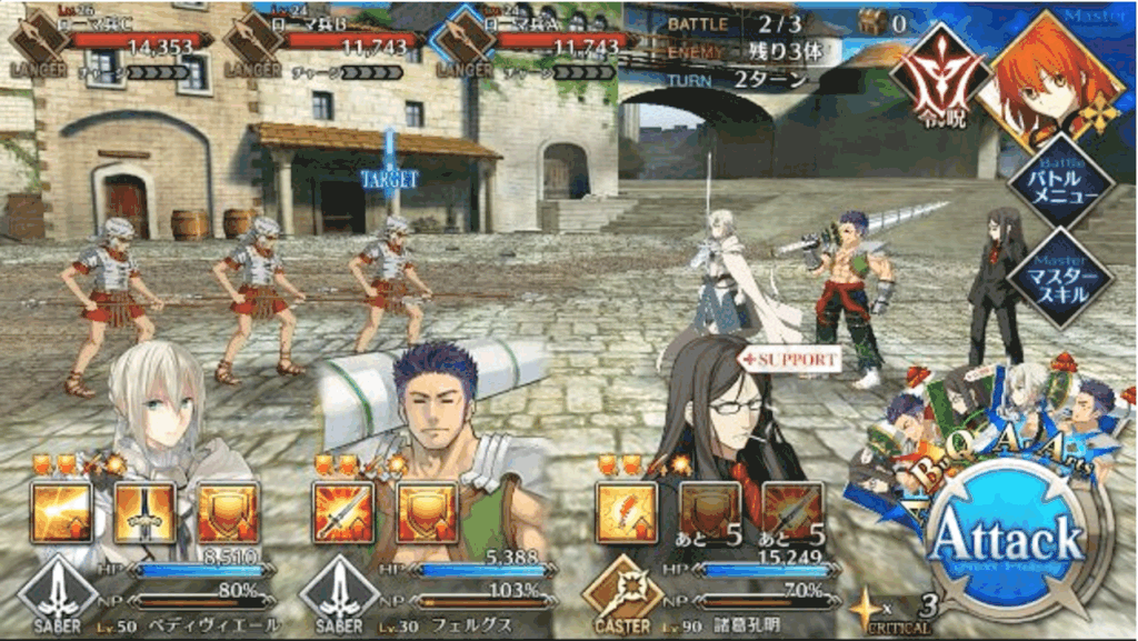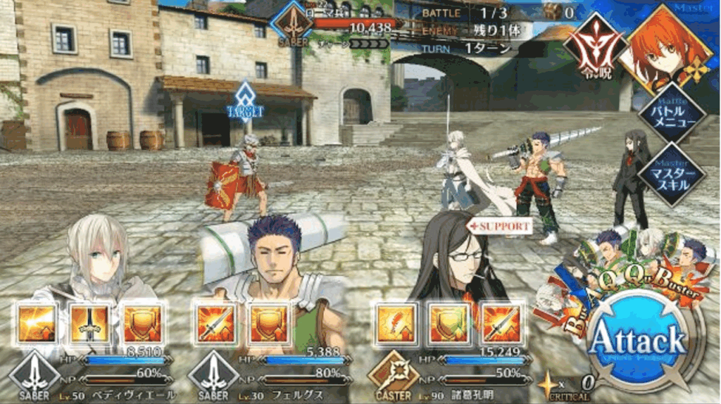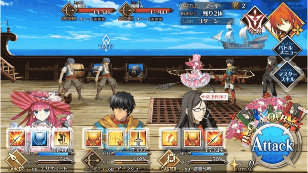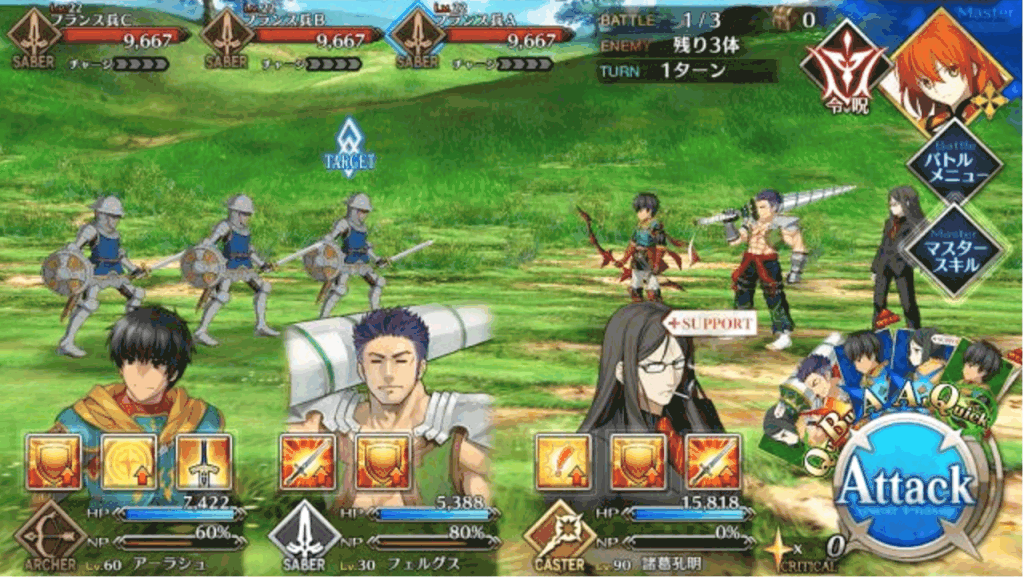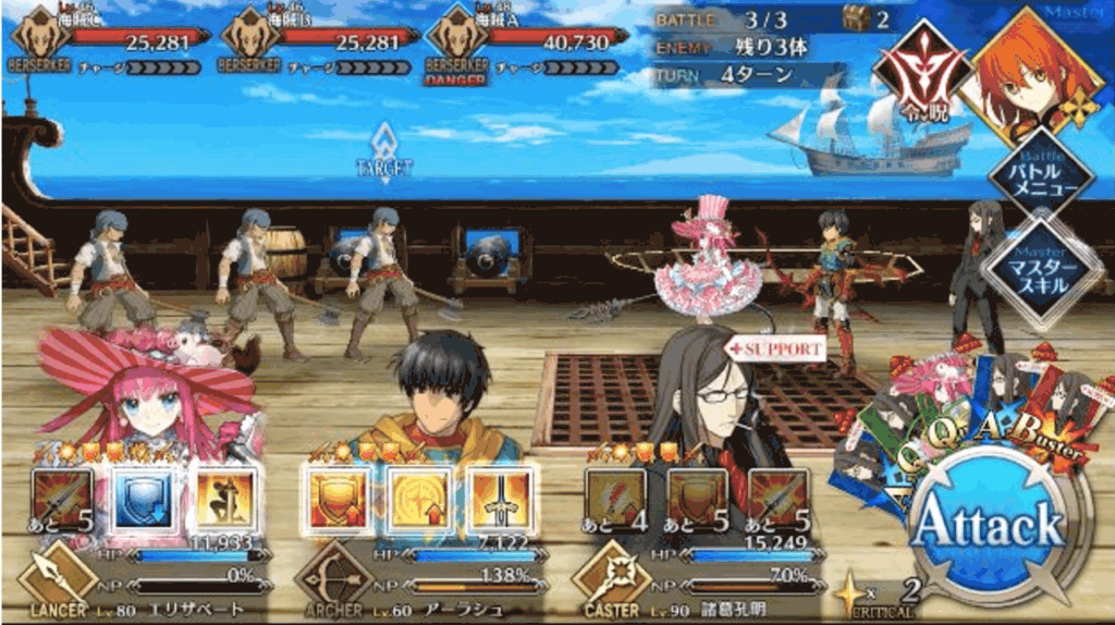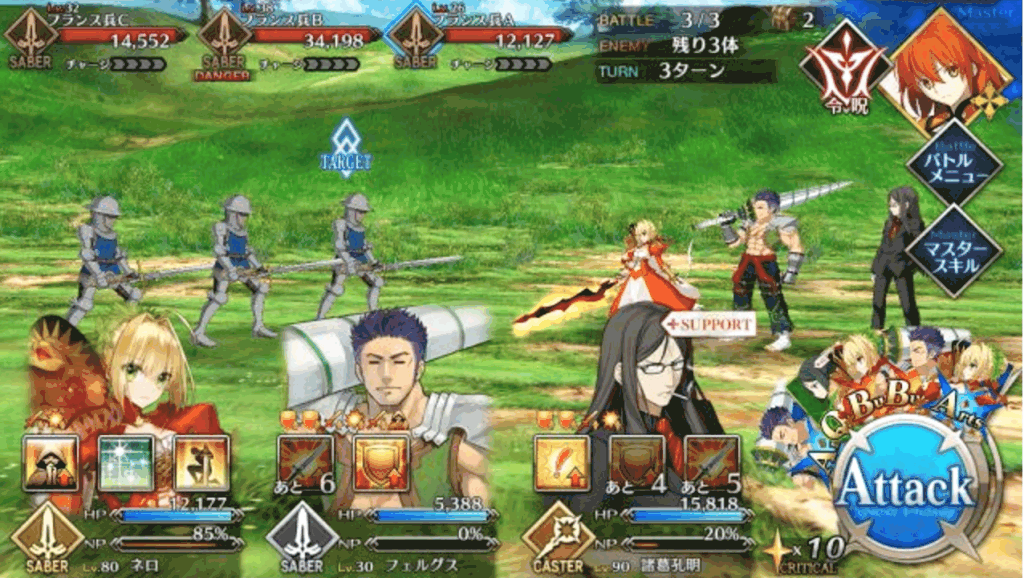 Lv 味方全体の攻撃力と防御力とスター発生率をアップ(3T)〔発動率〕 60% / 70% / 75% / 77.5% / 80%