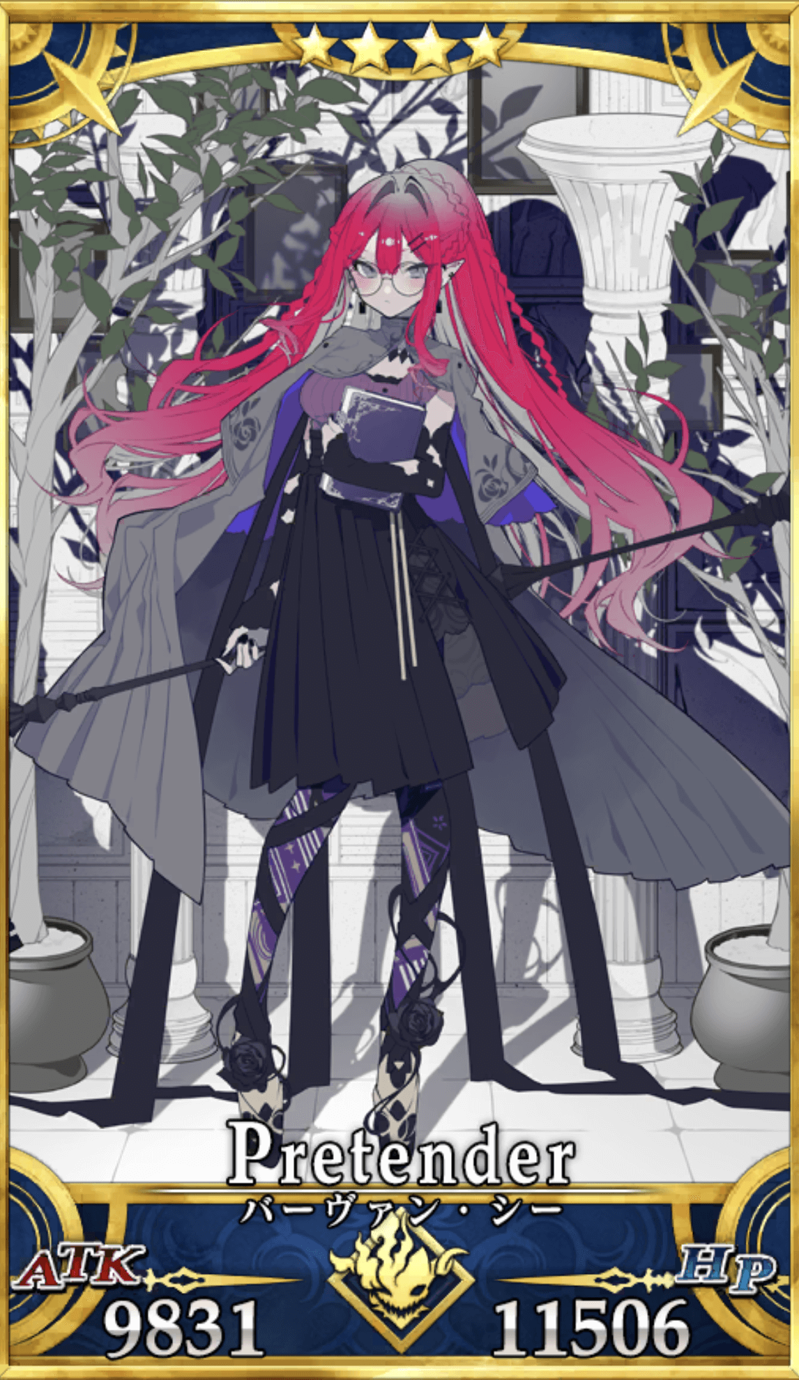 | 宝具 | ・OC自身のバスター性能をアップ(1T)<20%~40%> ・毎ターンHP回復状態を付与(3T)<1,000> ・毎ターンNP獲得状態を付与(3T)<10%> ・毎ターンスター獲得状態を付与(3T)<10個> ・Lv敵全体に強力な攻撃<300%~500%> ・〔人の力を持つ敵〕特攻<150%> ・呪い状態を付与(3T)<2,000> ・毒状態を付与(3T)<2,000> ・攻撃力ダウンを付与(1T)<50%> |