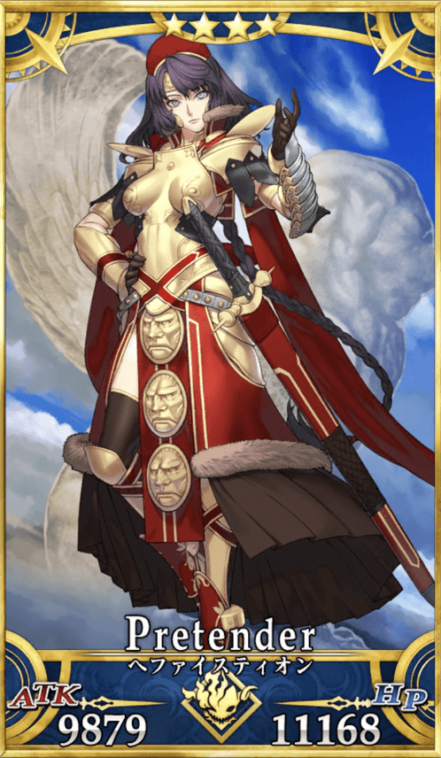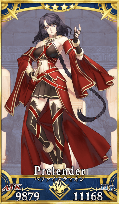 | 身長/体重:168cm・58kg 出典:史実、『ロード・エルメロイⅡ世の事件簿』 地域:マケドニア 属性:中立・中庸 副属性:地 性別:女性 通常であれば、彼女ではなく、本物のヘファイスティオンが召喚されるだろう。 |