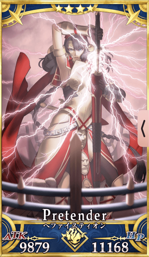ヘファイスティオンはNP100%以上チャージするスキルで即宝具発動ができ、単体ボスの処理が得意な単体宝具アタッカーだ。プリテンダーかつキャスターにもクラス相性有利になるスキルを持つため、多くのクラスに相性有利で攻撃できるのが強み。