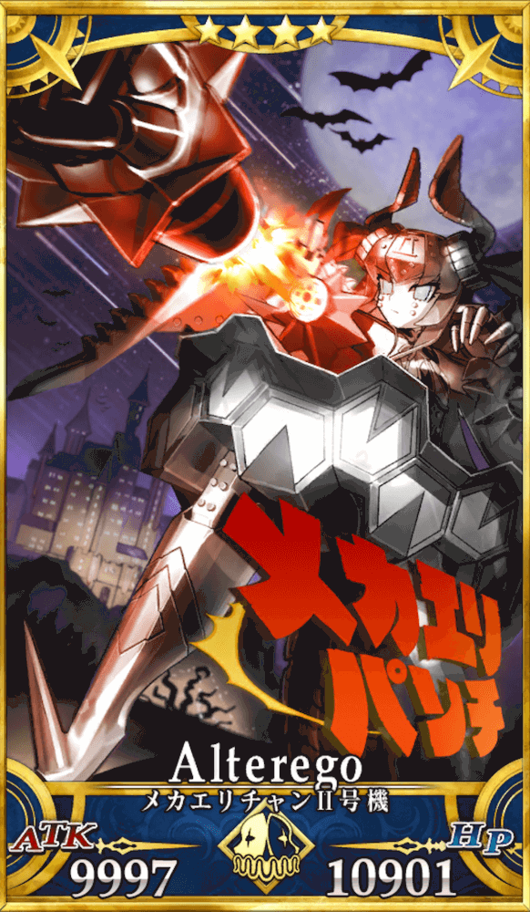 | 混迷極まるハロウィンに現れた、もう一機の怪サーヴァント。 その外見はメカエリチャンと類似しており、宝具もメカエリチャンとうり二つで、スキルもパラメーターもぴったり同じ。 この奇妙な符合は一体なにを示しているのか……。 エリザベート種の中でもっとも賢く、またヒロイン力(ちから)が高いという話だが、果たして───? 「……忠告しておくけど。コンパチと言ったら殺すから」 |
