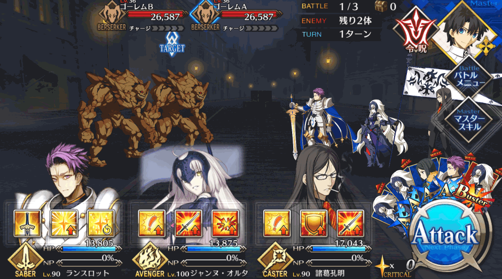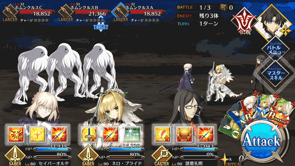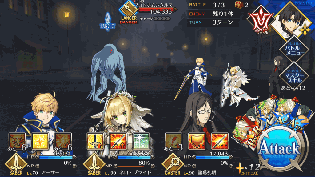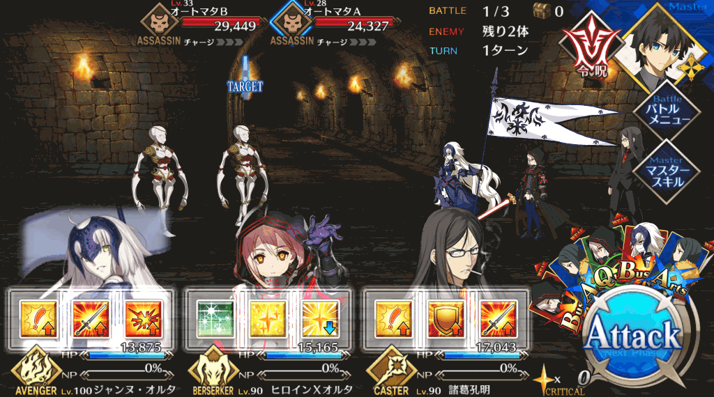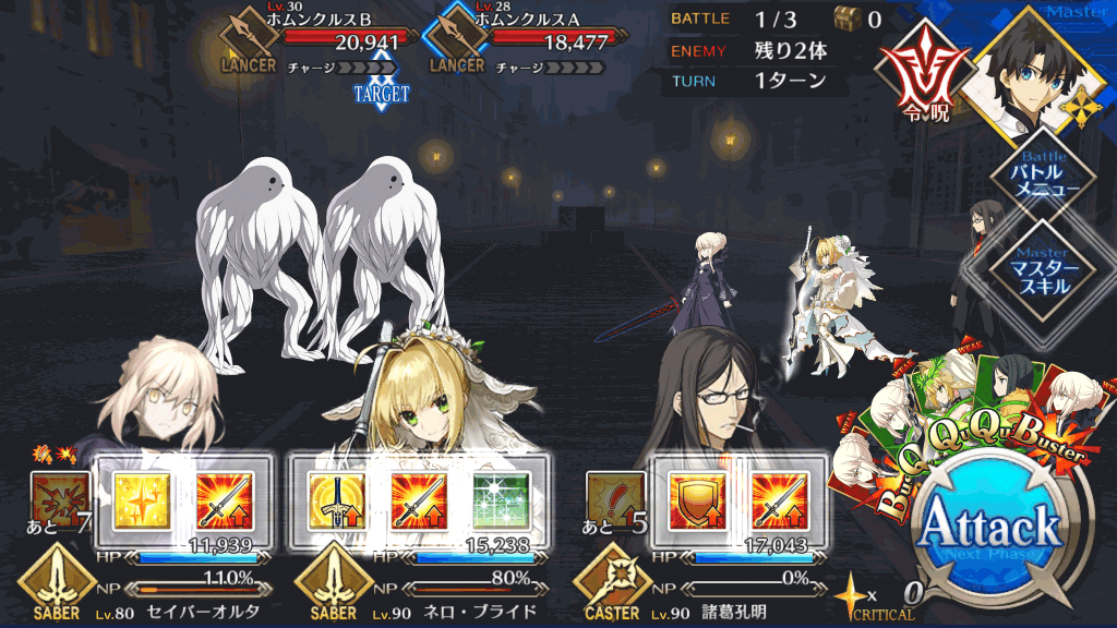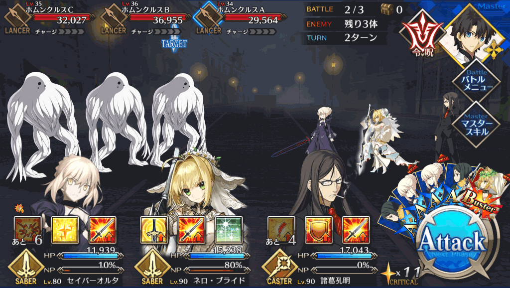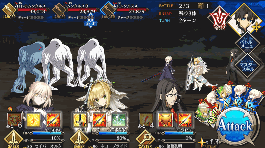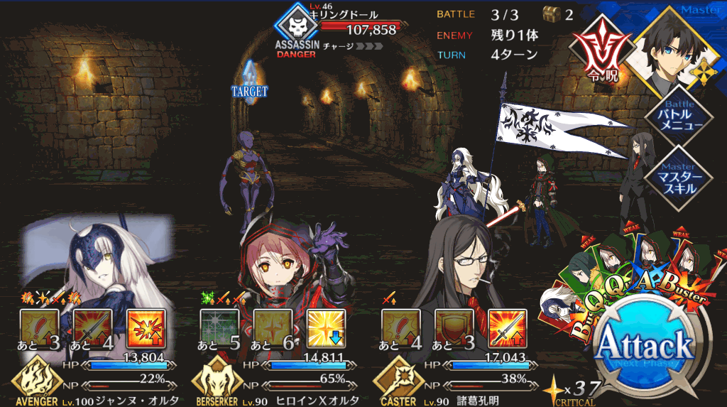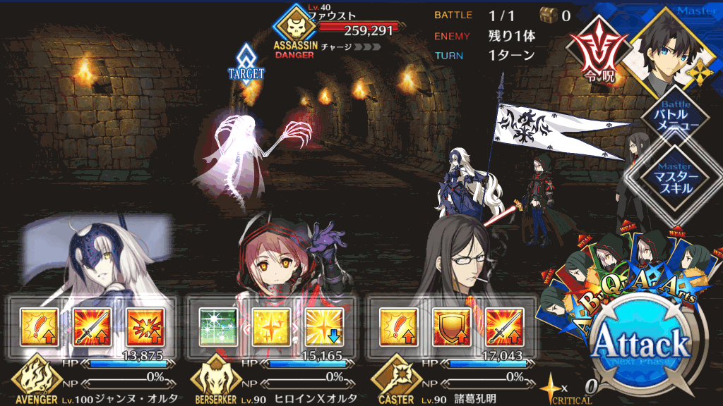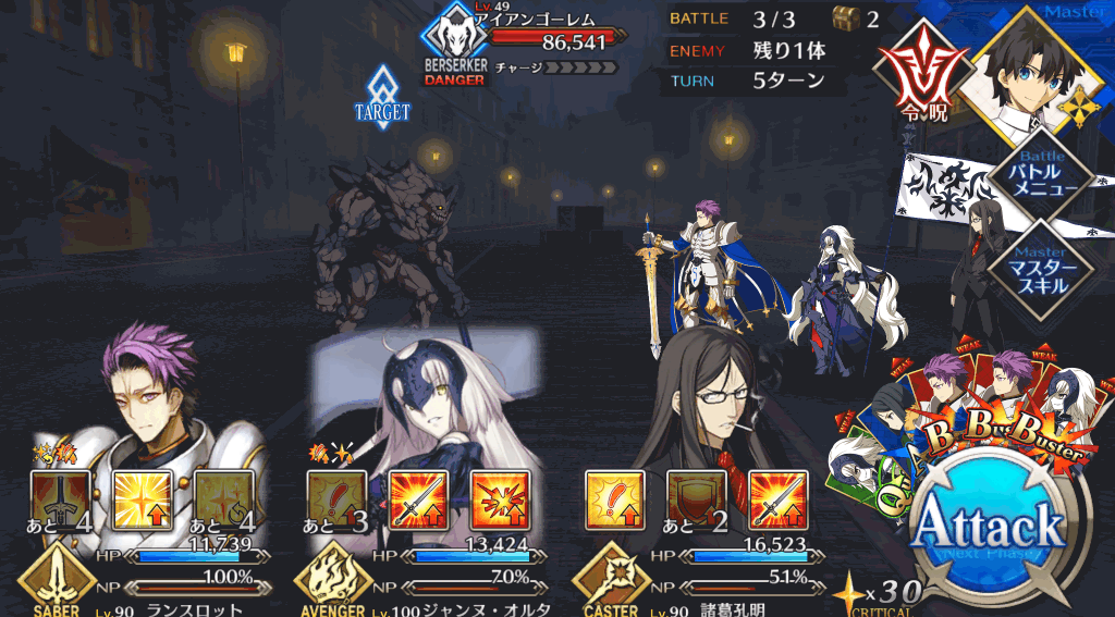 | 宝具 | ・Lv敵全体に強力な防御力無視攻撃<400%~600%> ・OC呪いを付与(3T)<500~2,500> |